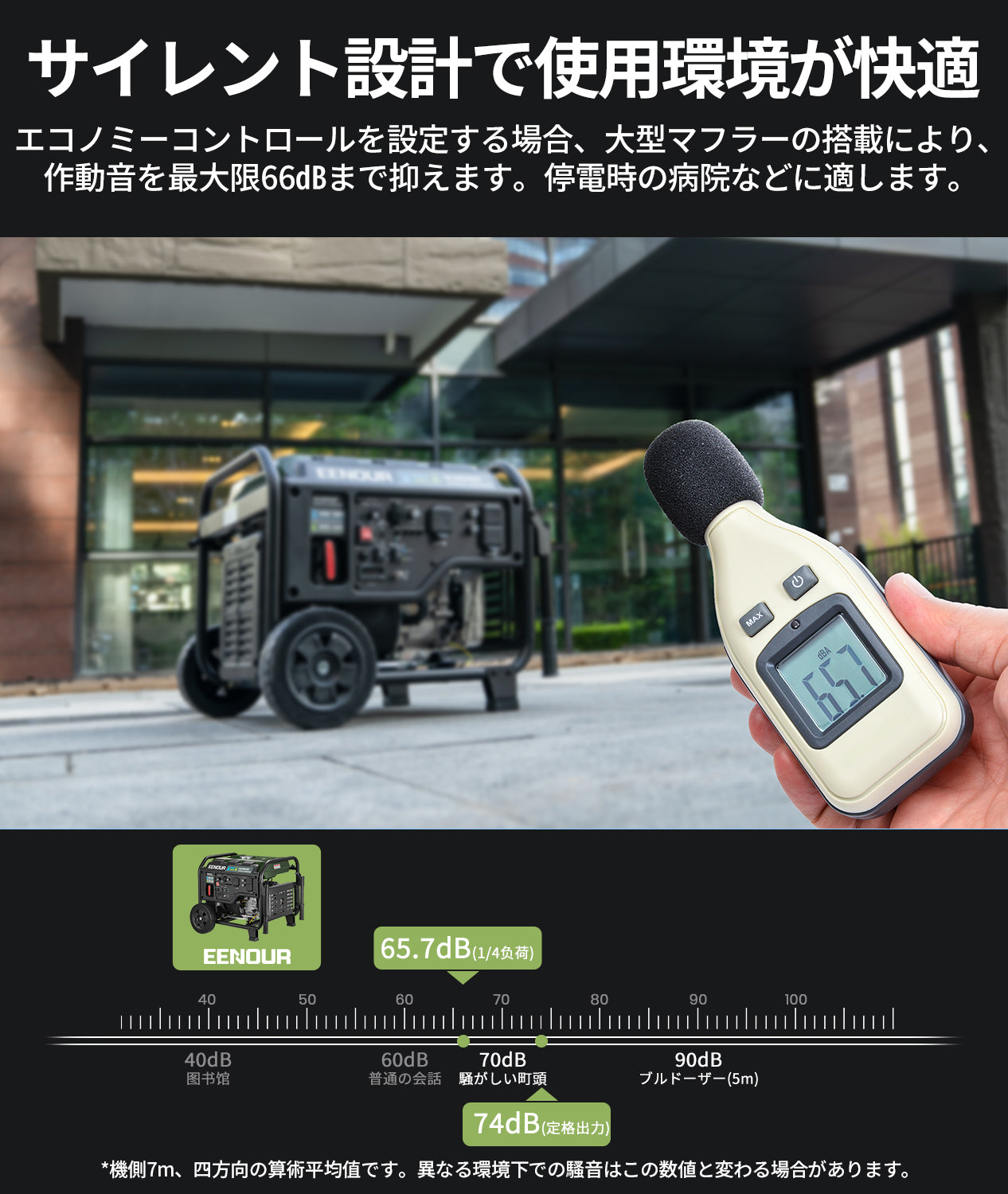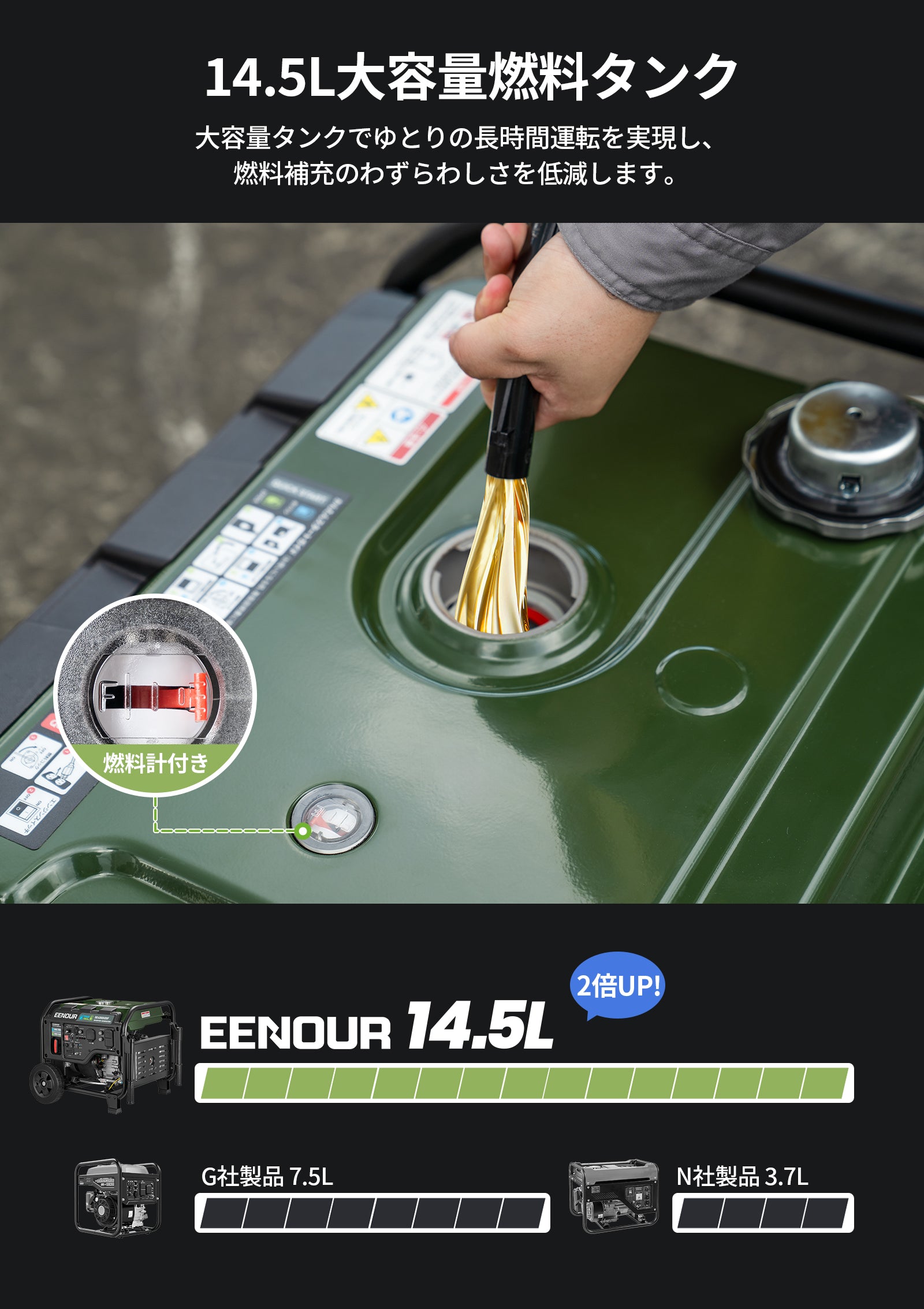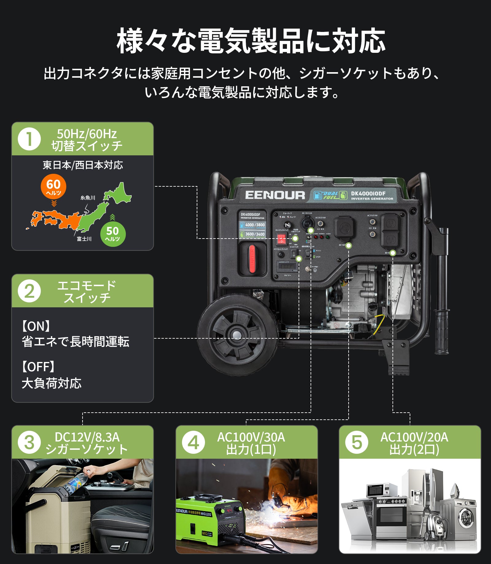 EENOURでは、インバーター式、単相100V・200V対応の小型エンジン発電機を取り扱っております。
