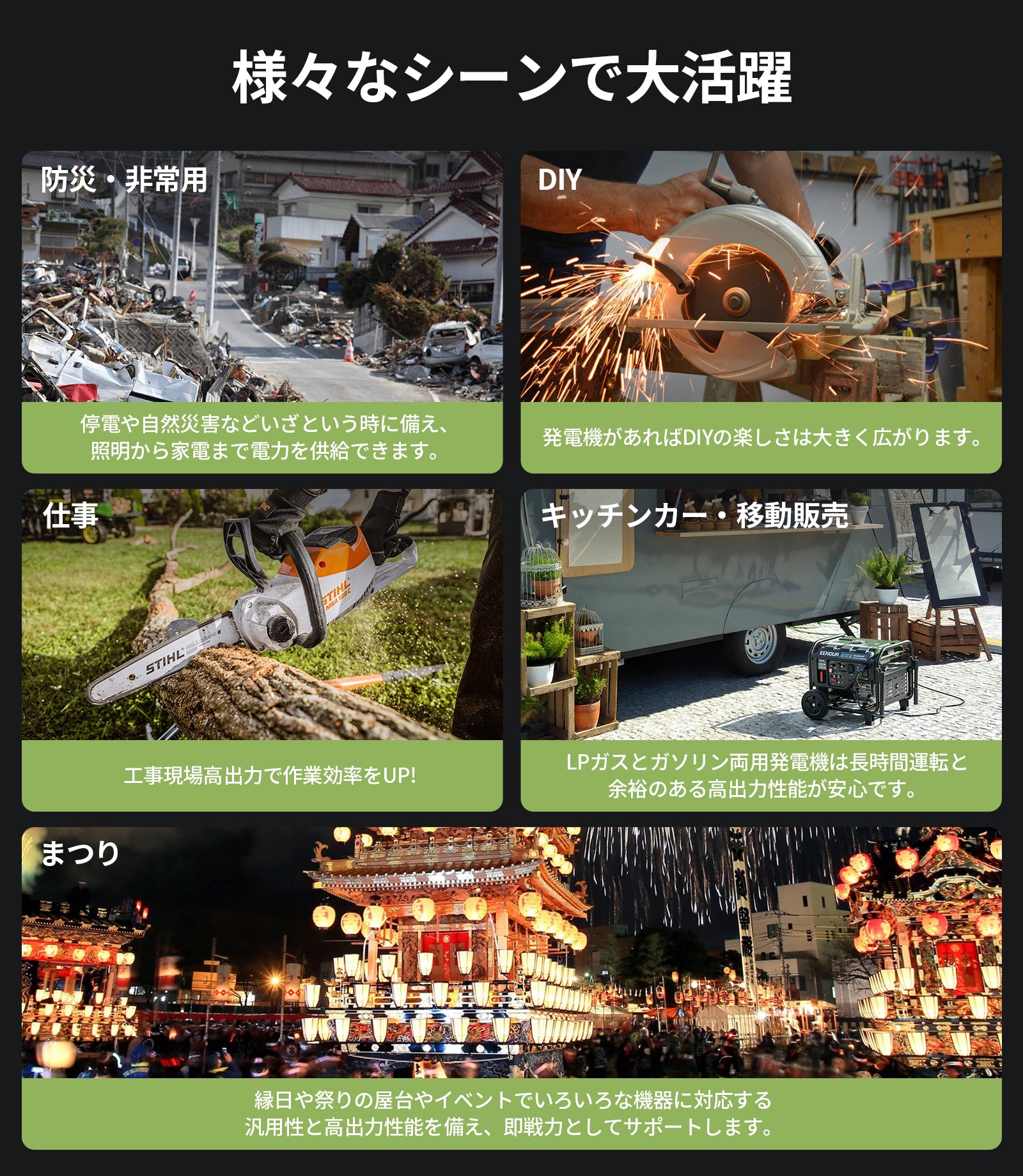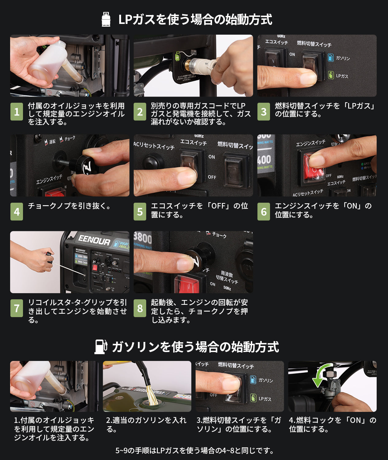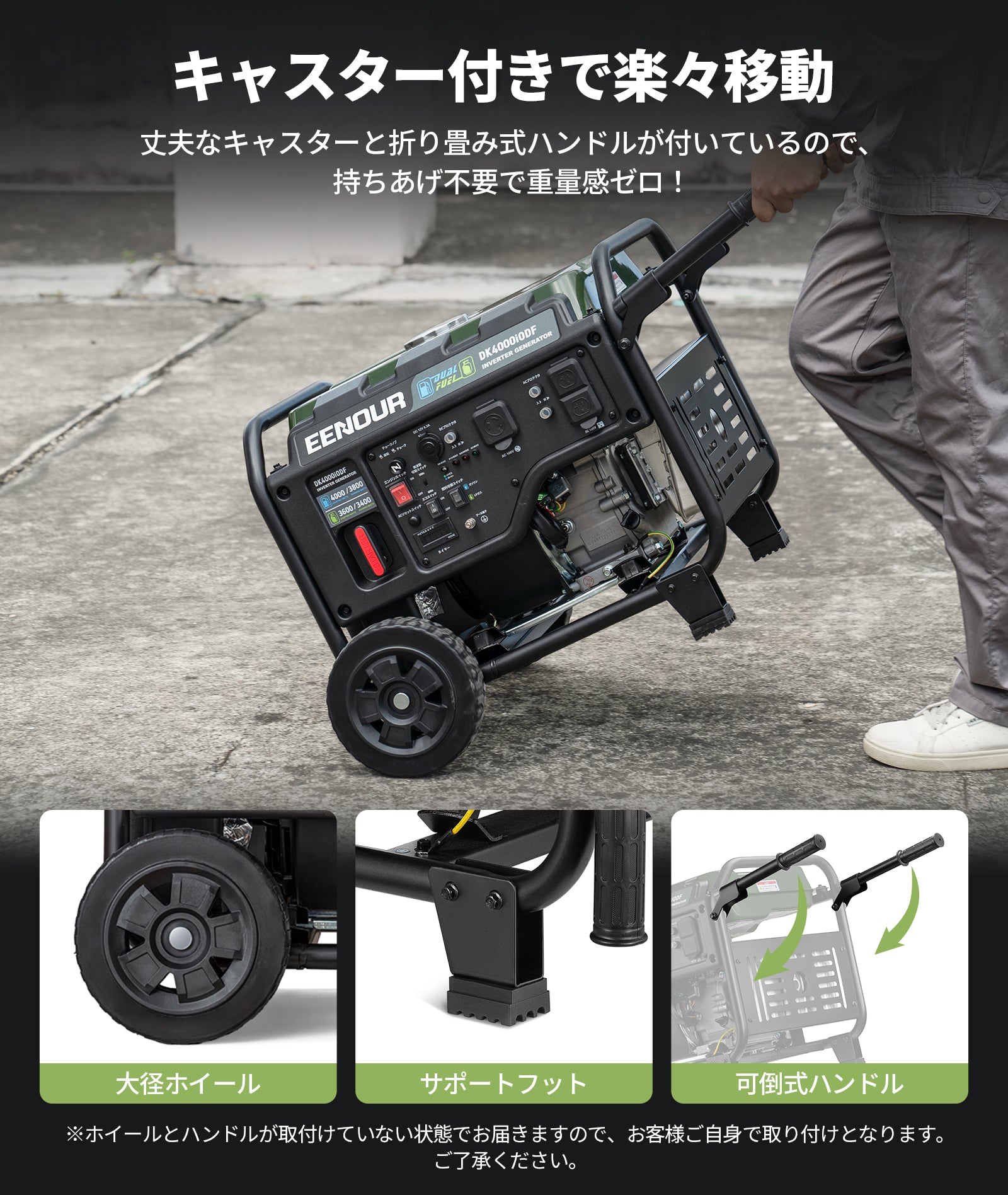 EENOURでは、インバーター式、単相100V・200V対応の小型エンジン発電機を取り扱っております。