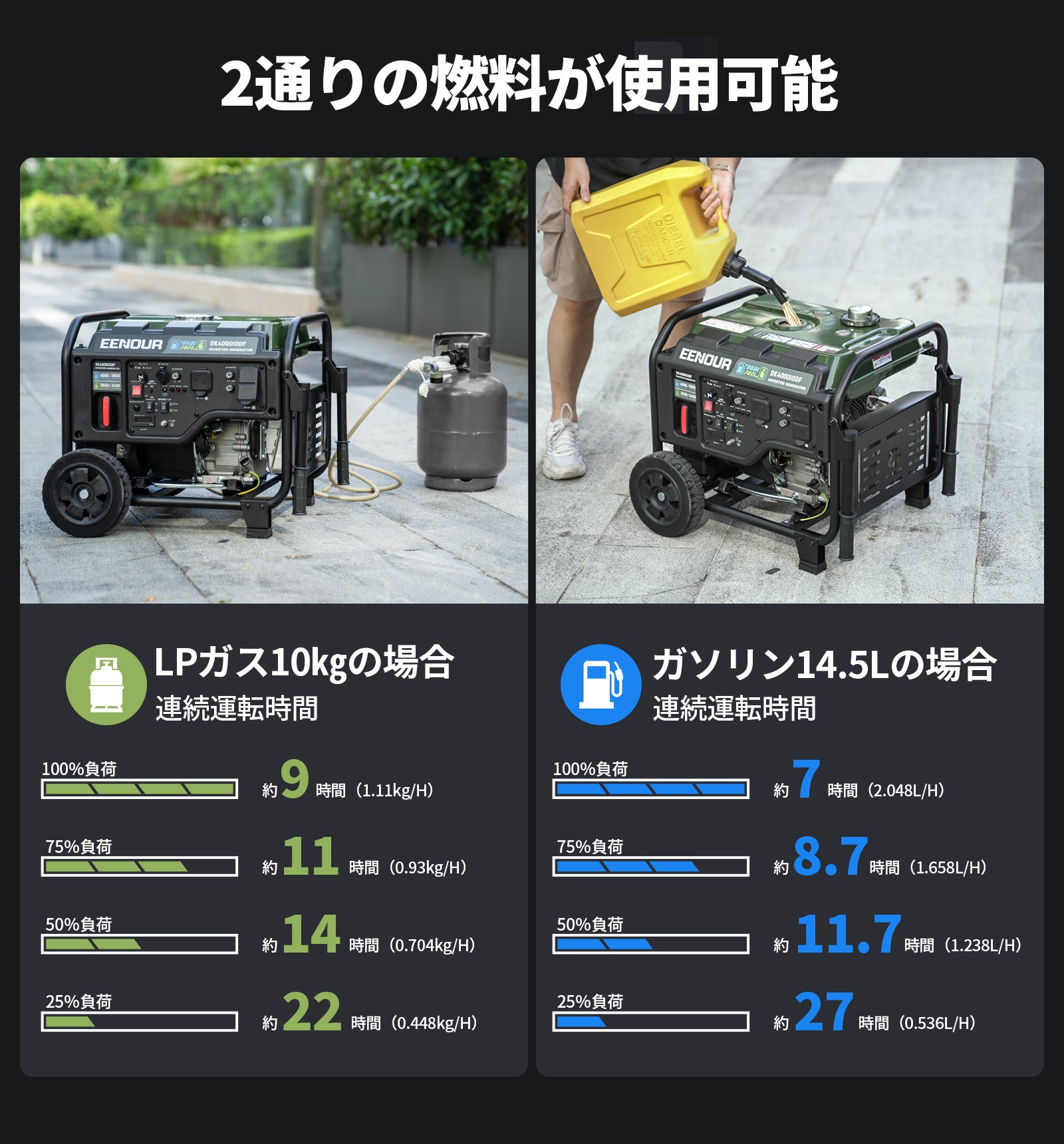 • DK4500iAEFI: 約3時間(定格負荷)〜10時間(1/4負荷)