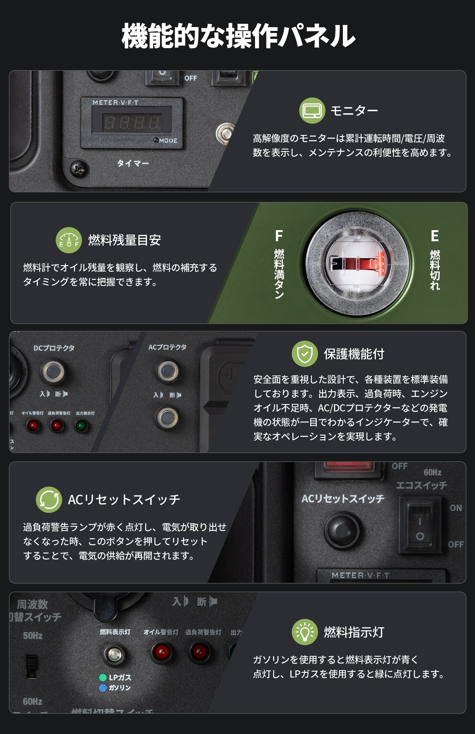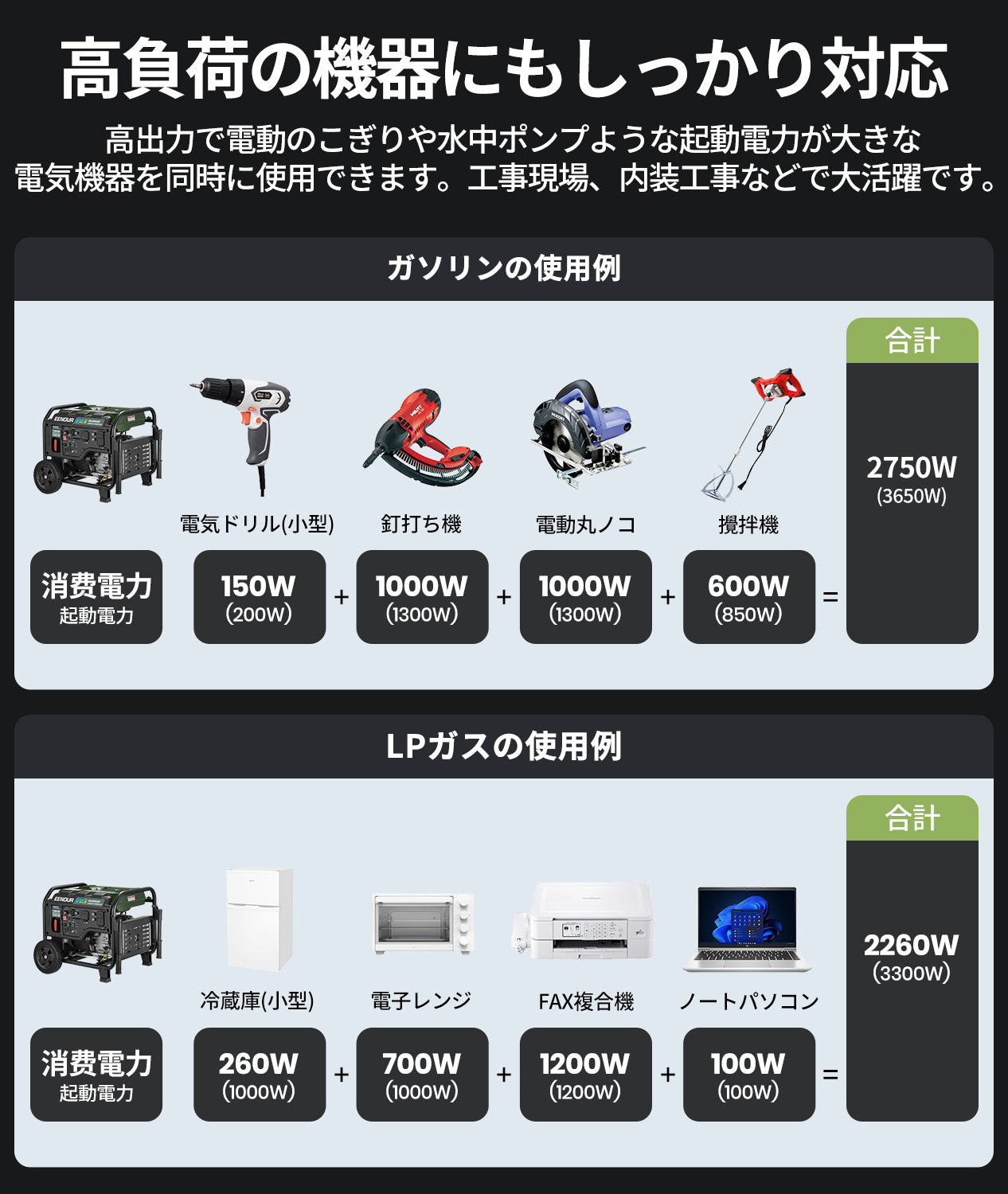 使用する機器の消費電力(W)にご注意ください。発電機の定格出力を超える機器を同時に使用すると、過負荷による停止や故障の原因になります。特に起動時に大きな電力を必要とする機器(エアコン、冷蔵庫、コンプレッサー等)はご注意ください。