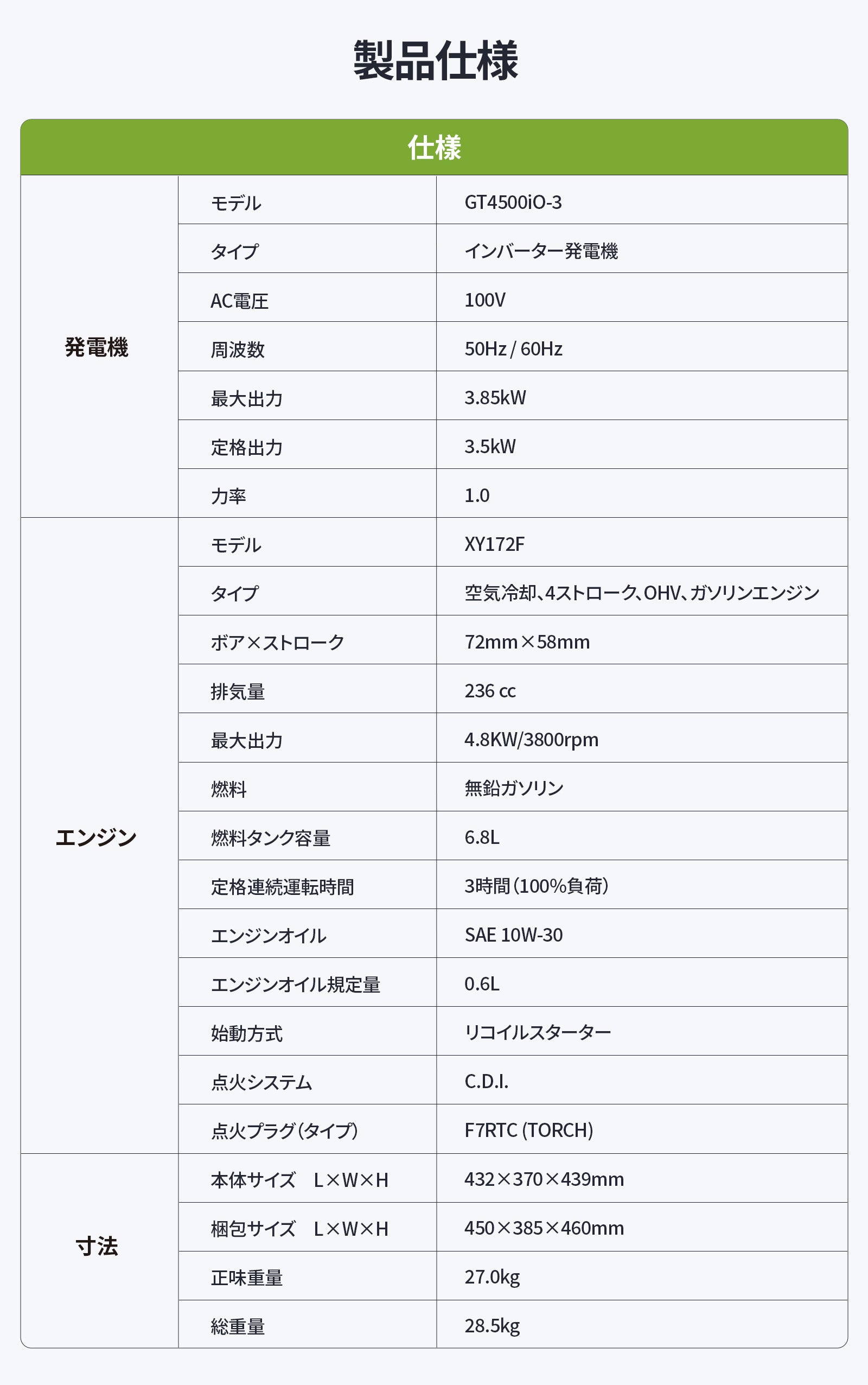 開放型インバーター発電機GT4500iO-3 製品仕様