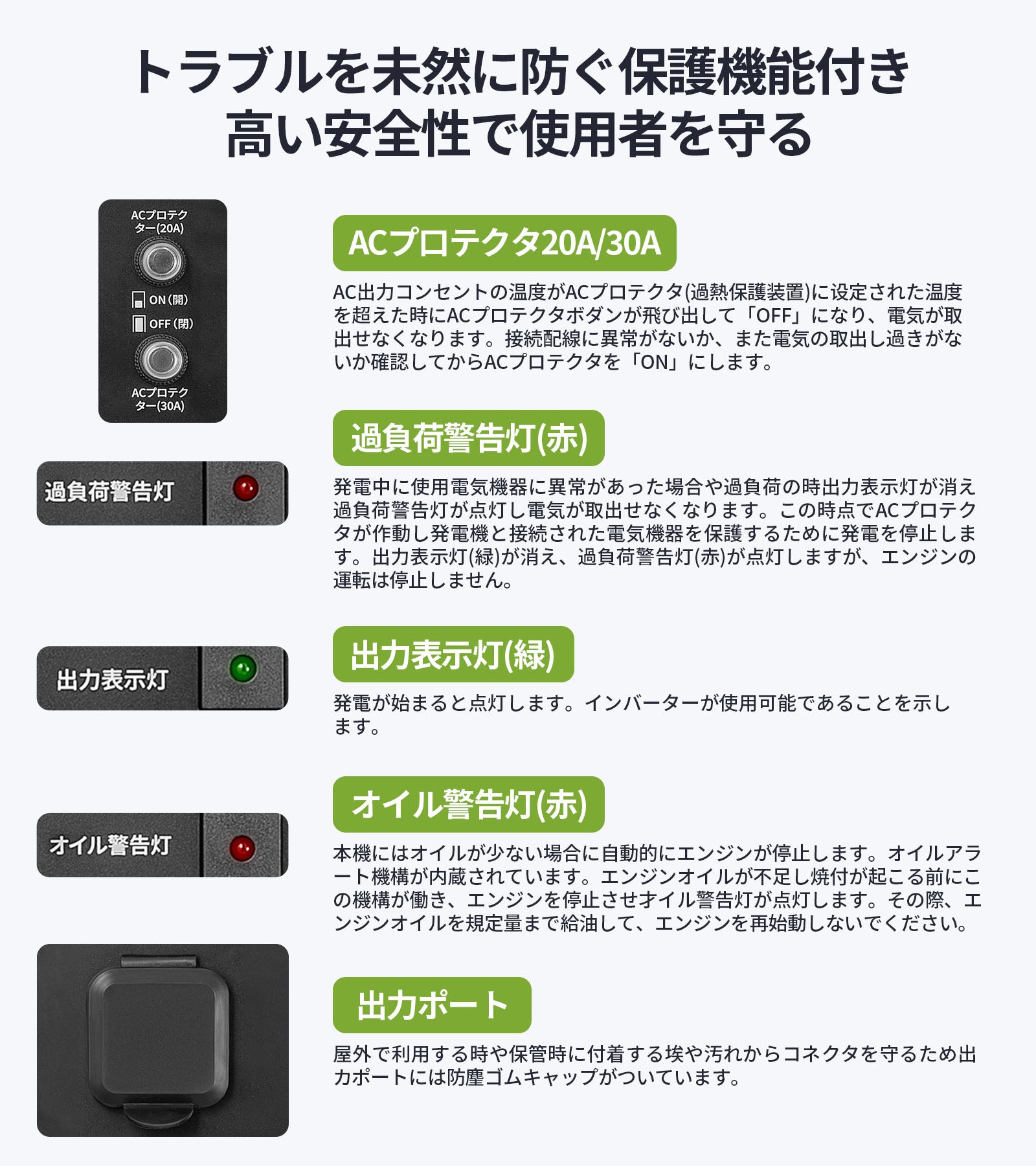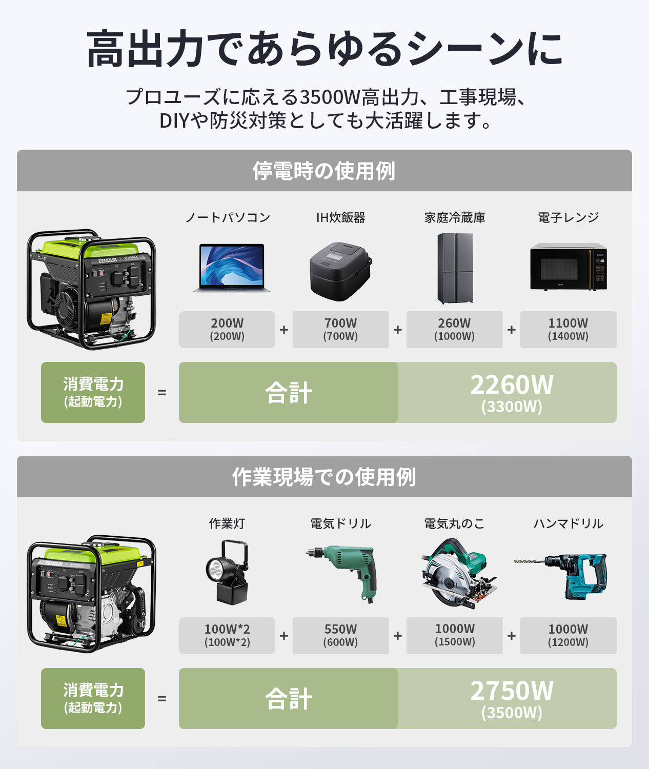 使用する機器の消費電力(W)にご注意ください。発電機の定格出力を超える機器を同時に使用すると、過負荷による停止や故障の原因になります。特に起動時に大きな電力を必要とする機器(エアコン、冷蔵庫、コンプレッサー等)はご注意ください。