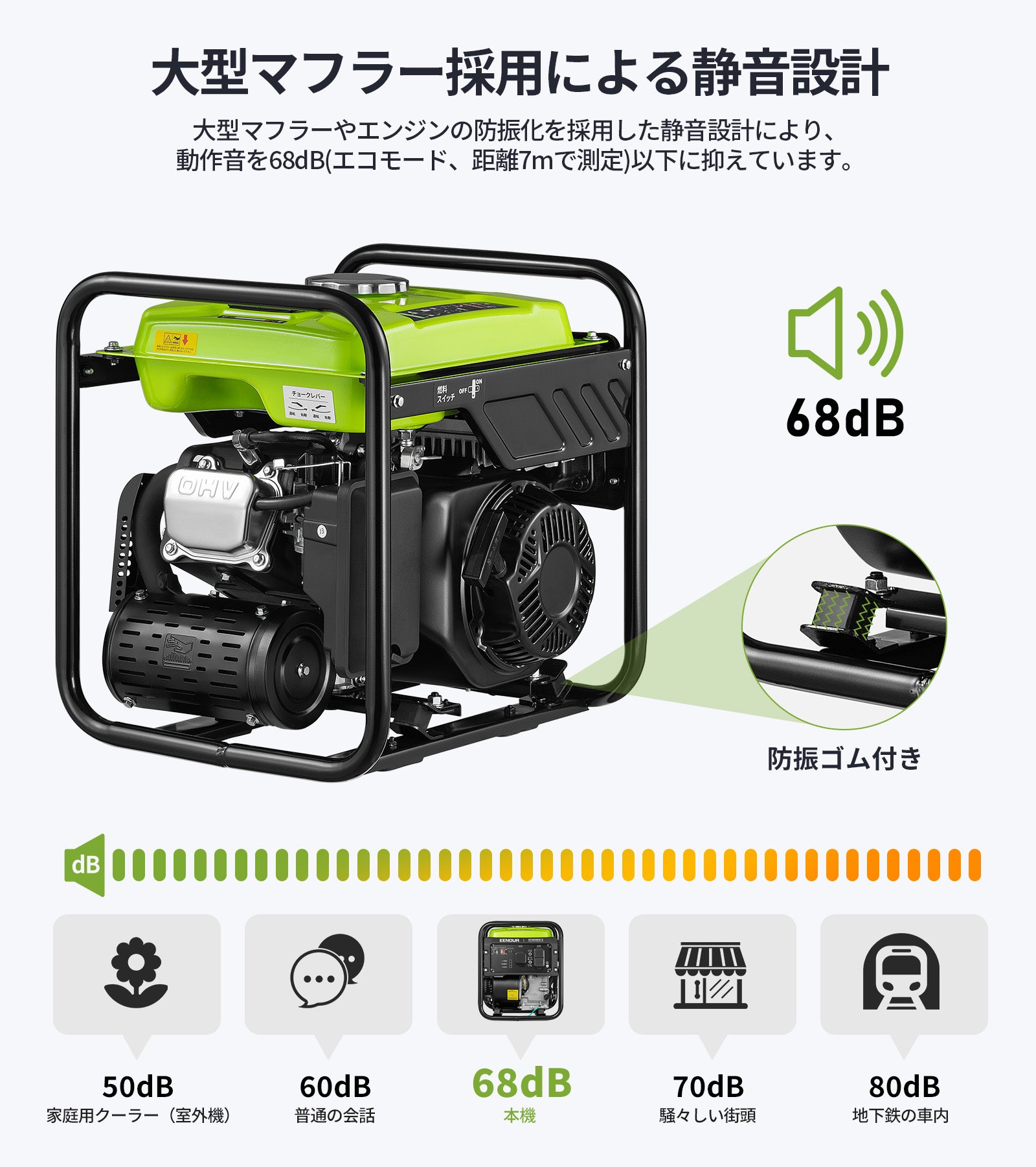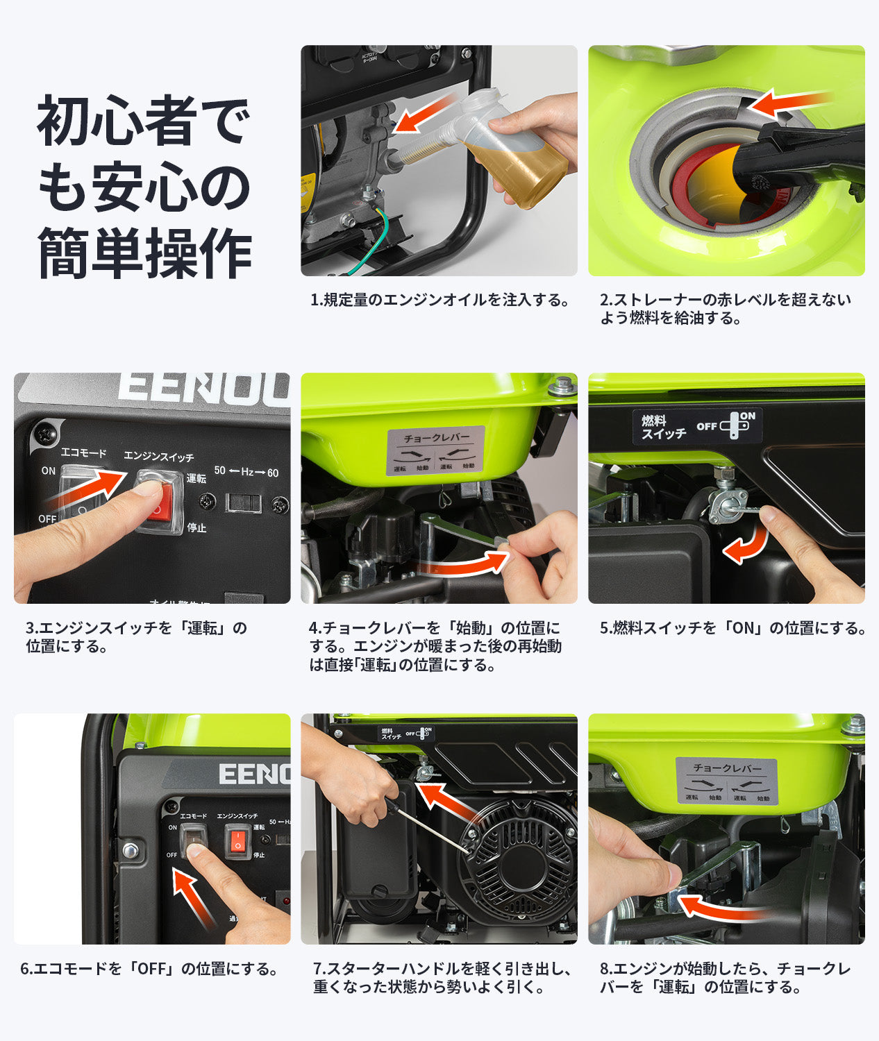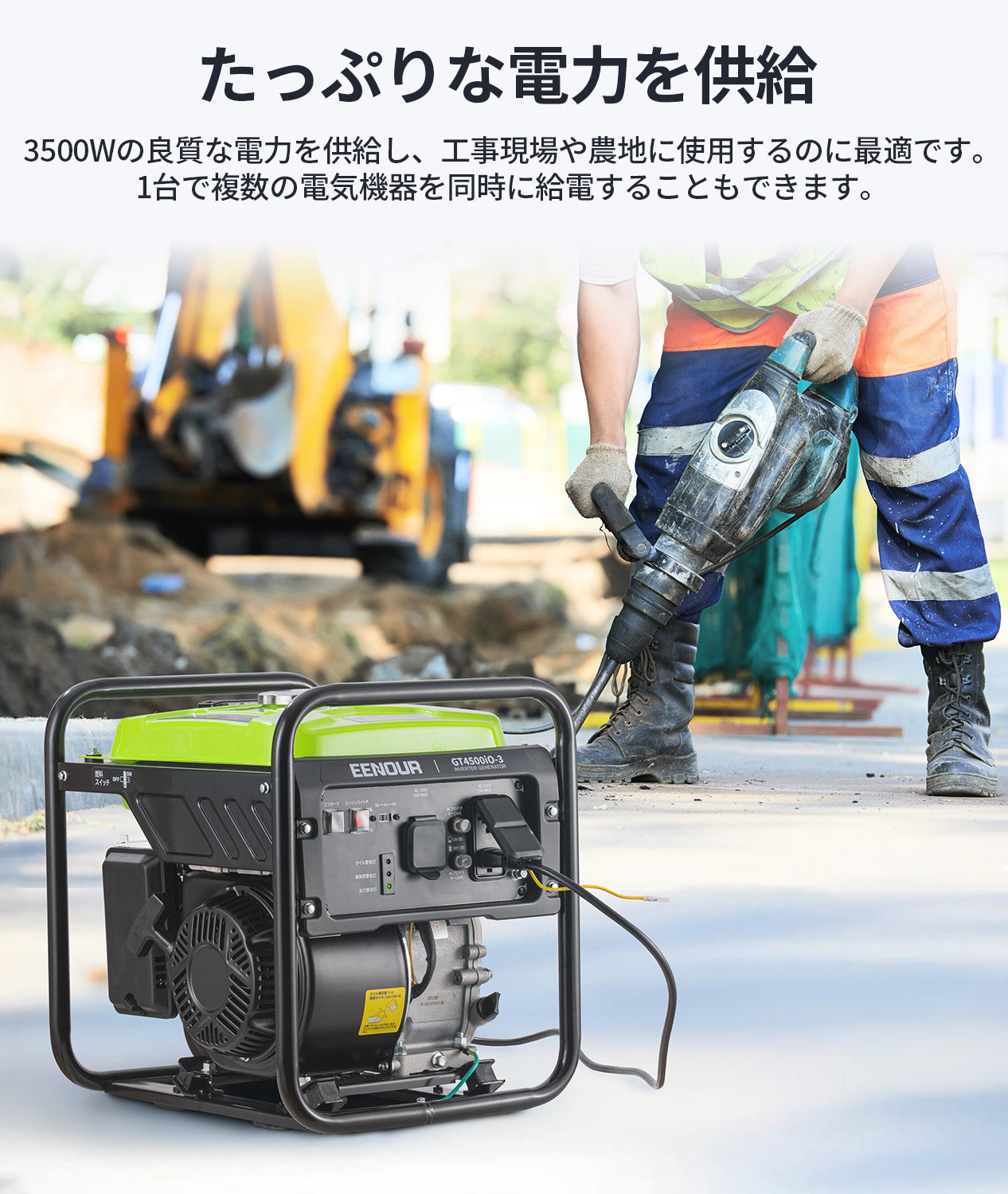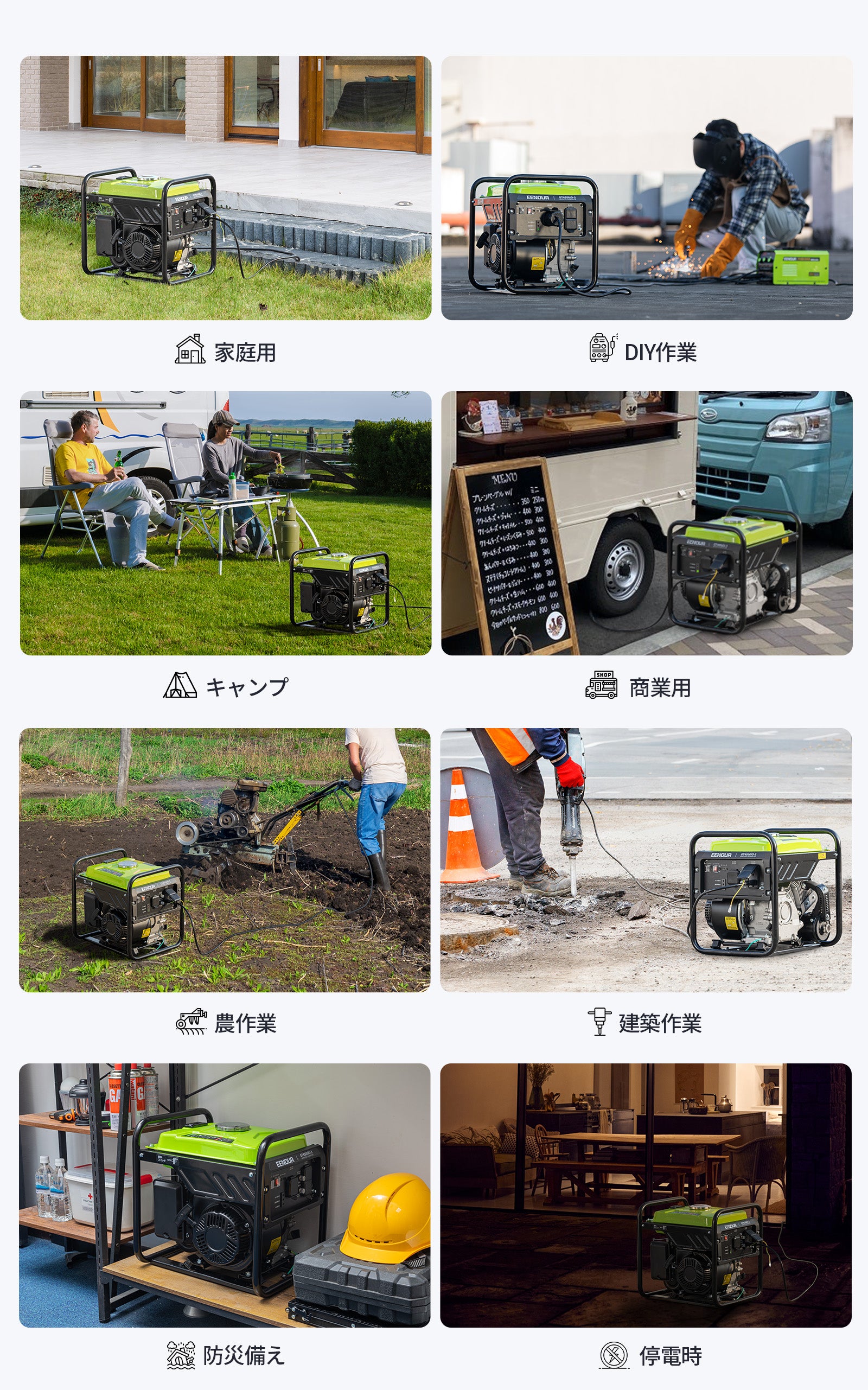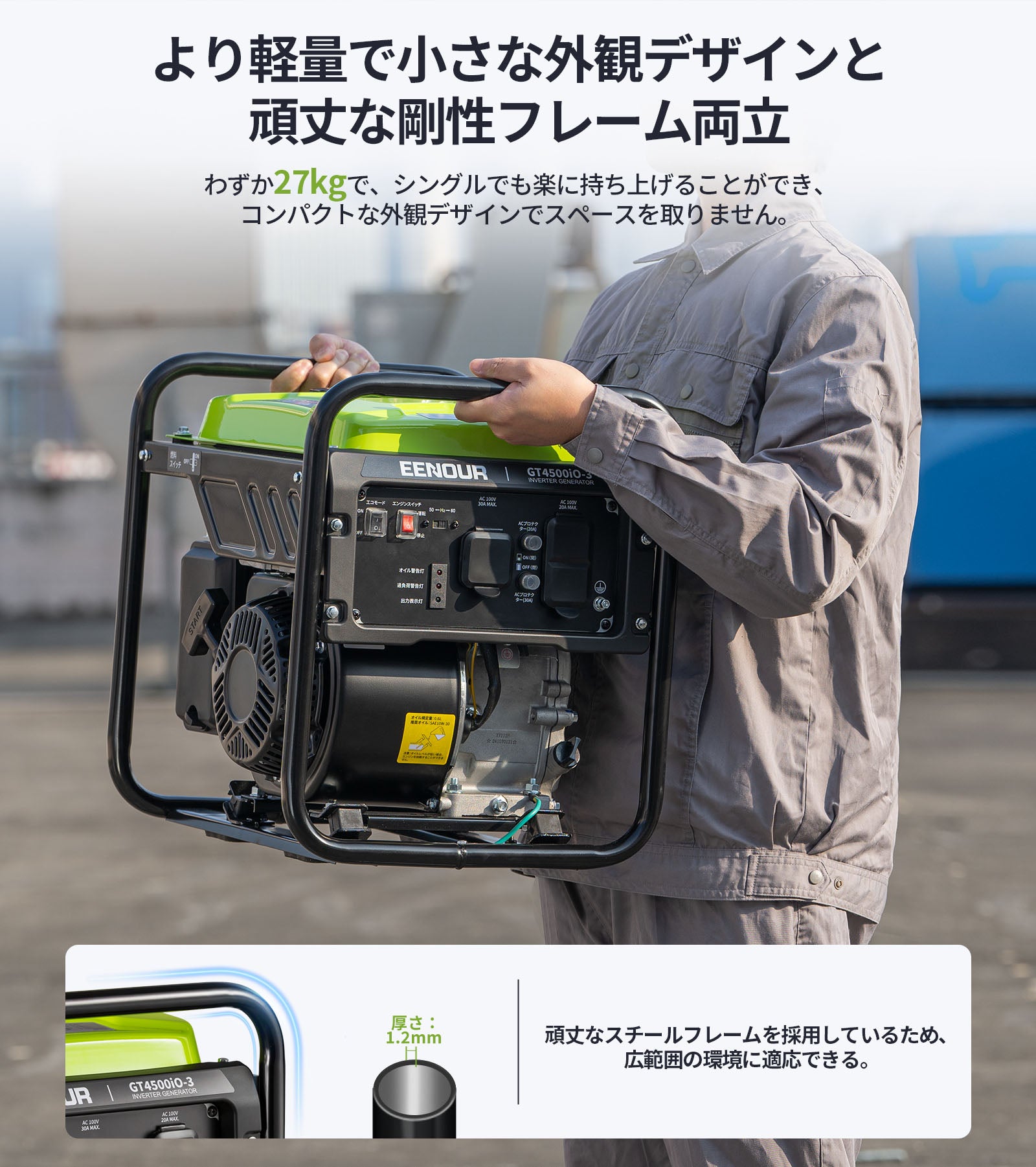 EENOURでは、インバーター式、単相100V・200V対応の小型エンジン発電機を取り扱っております。
