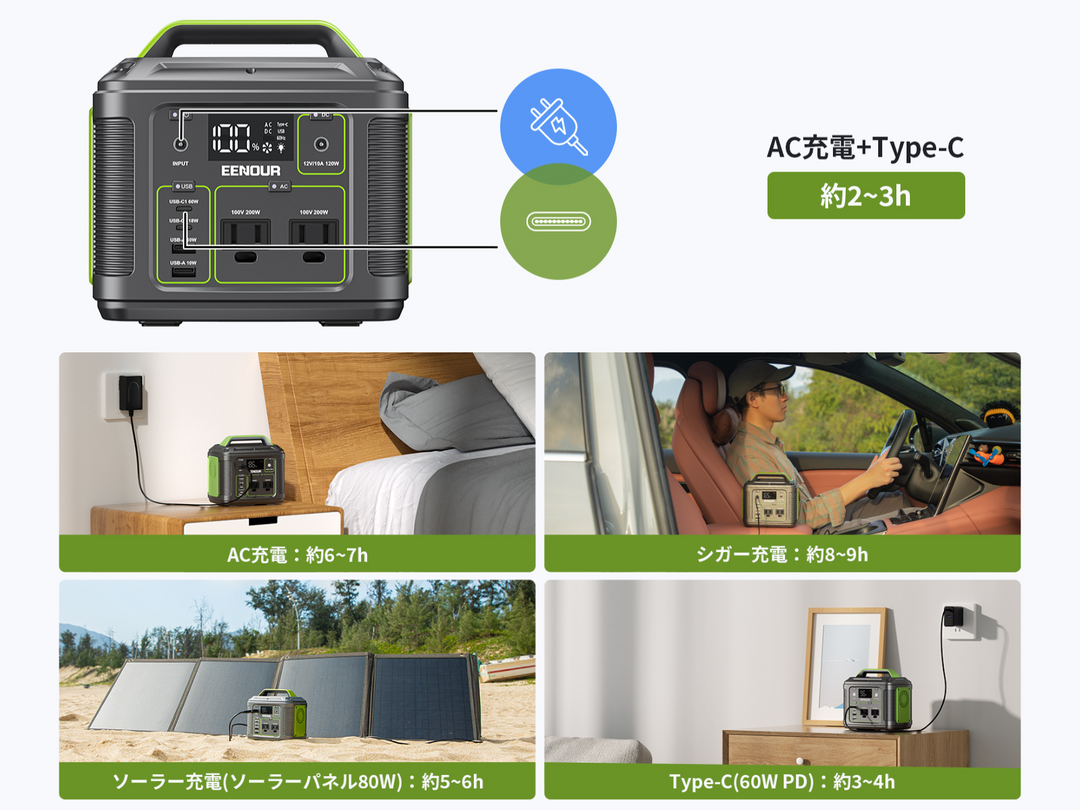 家庭用コンセント、車載シガーソケット、ソーラーパネル(別売)で充電可能です。屋外でも安心して使えます。