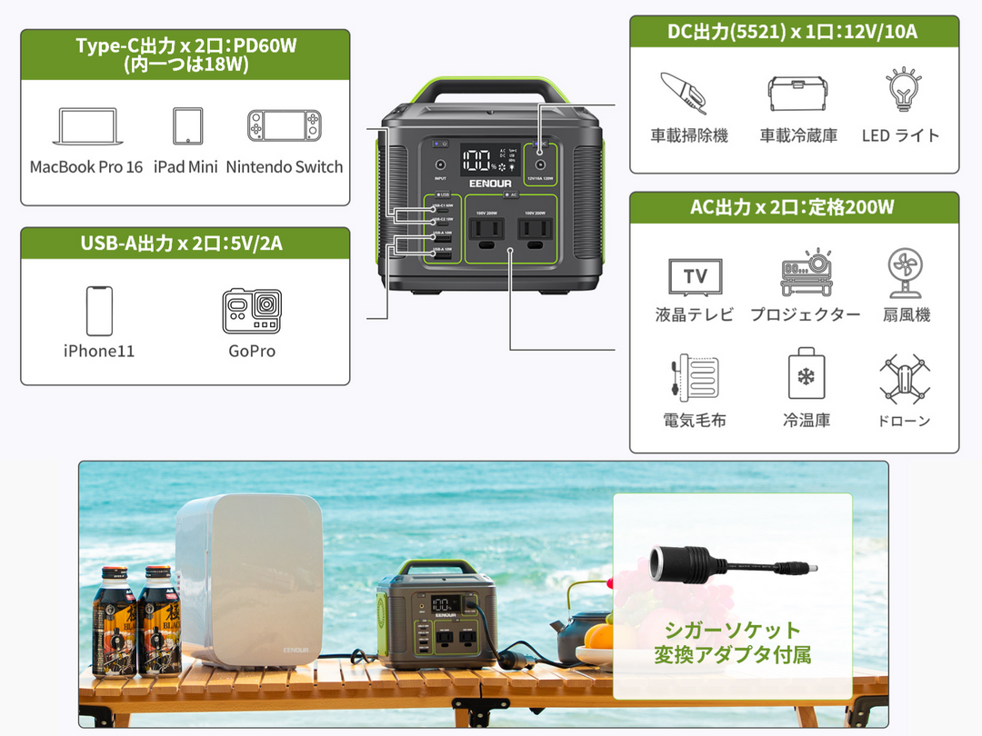 200Whのポータブル電源は、アウトドアや非常時にぴったりの電源ソリューションです。