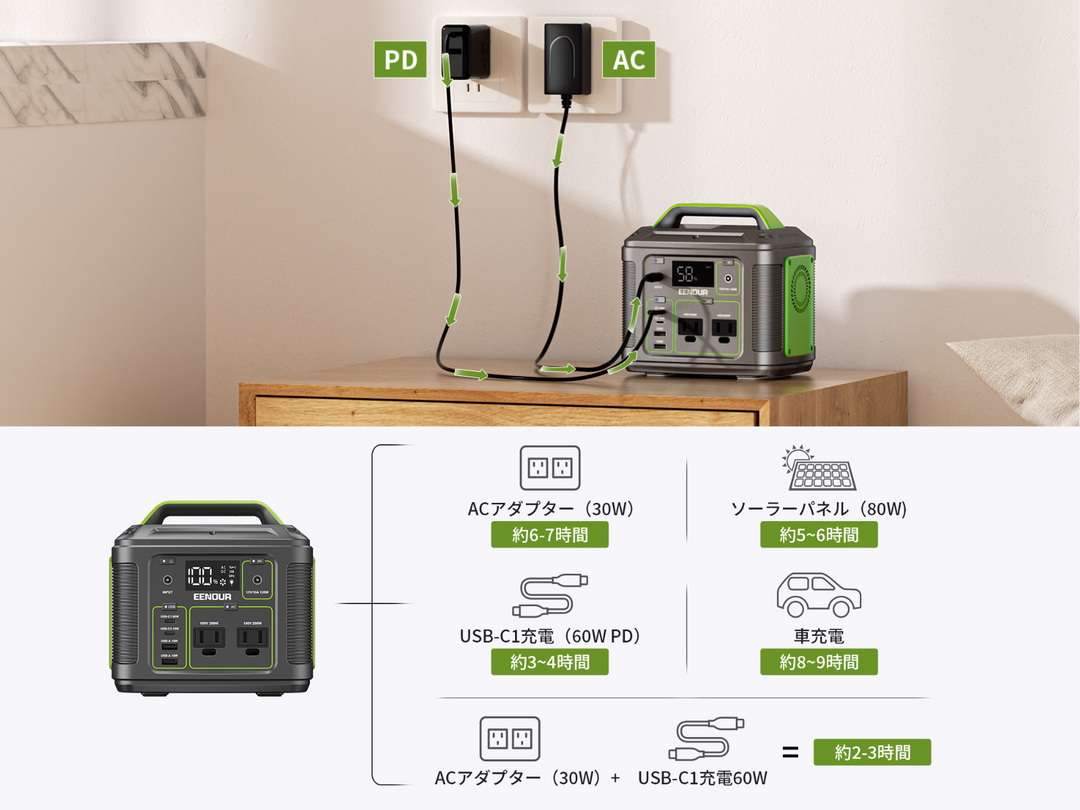 PDとACの同時充電にも対応しており、短時間でのフル充電が可能です(約2〜3時間)。急な出発前でも安心して準備が整います。