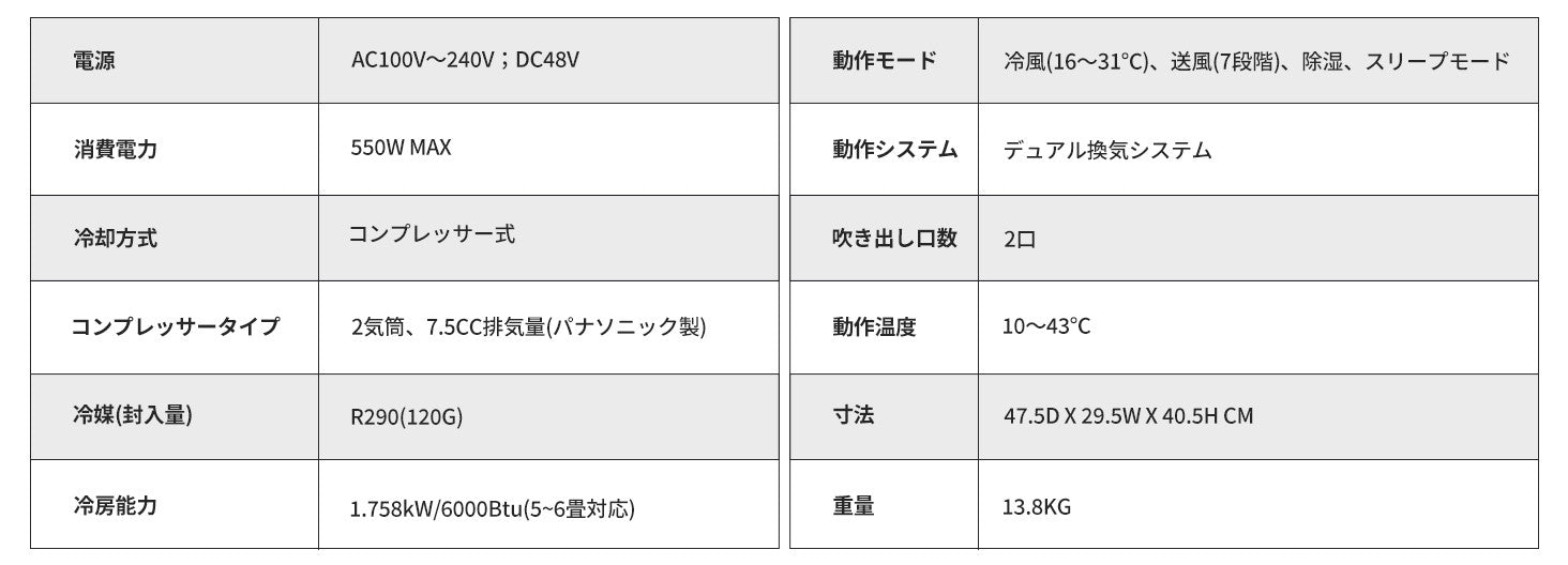 最大1.758kW(6000BTU)で、5〜6畳の空間を約3分で冷却可能です。