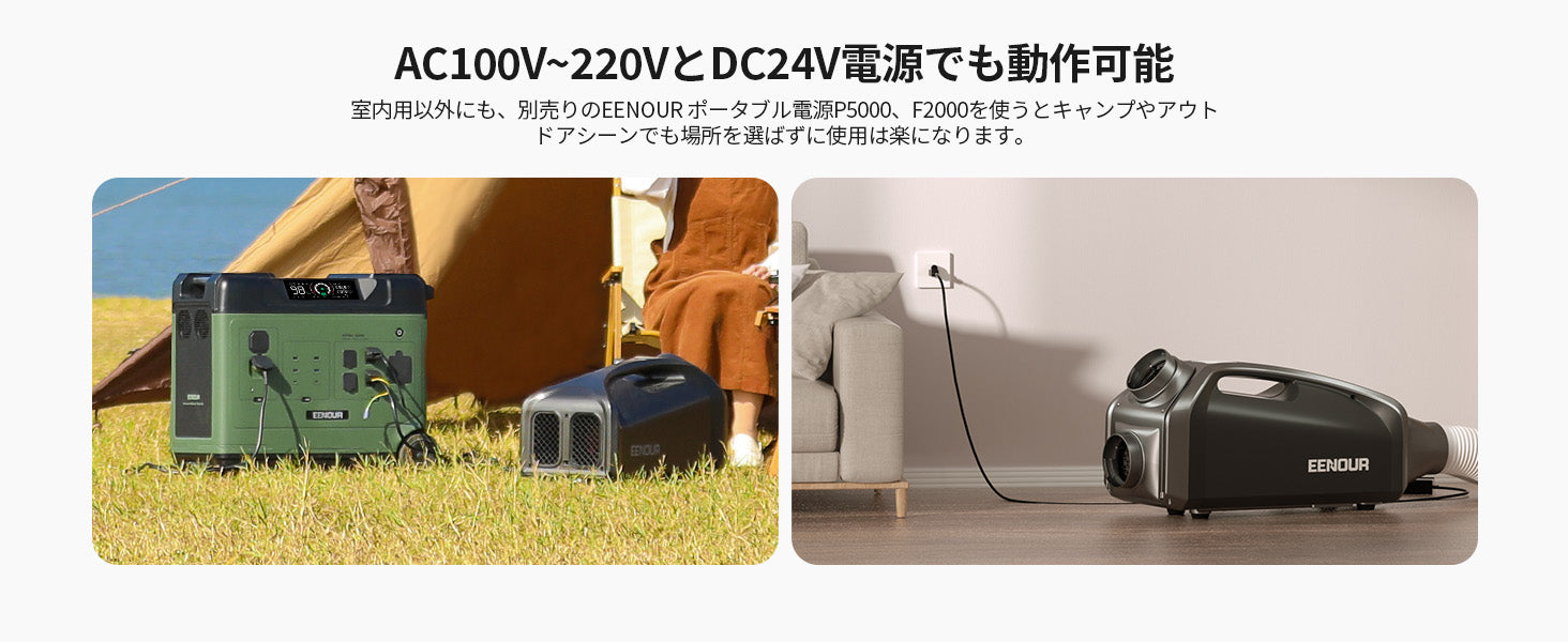 一般的なモデルは家庭用100Vコンセント、ポータブル電源などに対応しています。定格消費電力が高い場合は専用回路の使用や延長コードの取り扱いに注意してください。