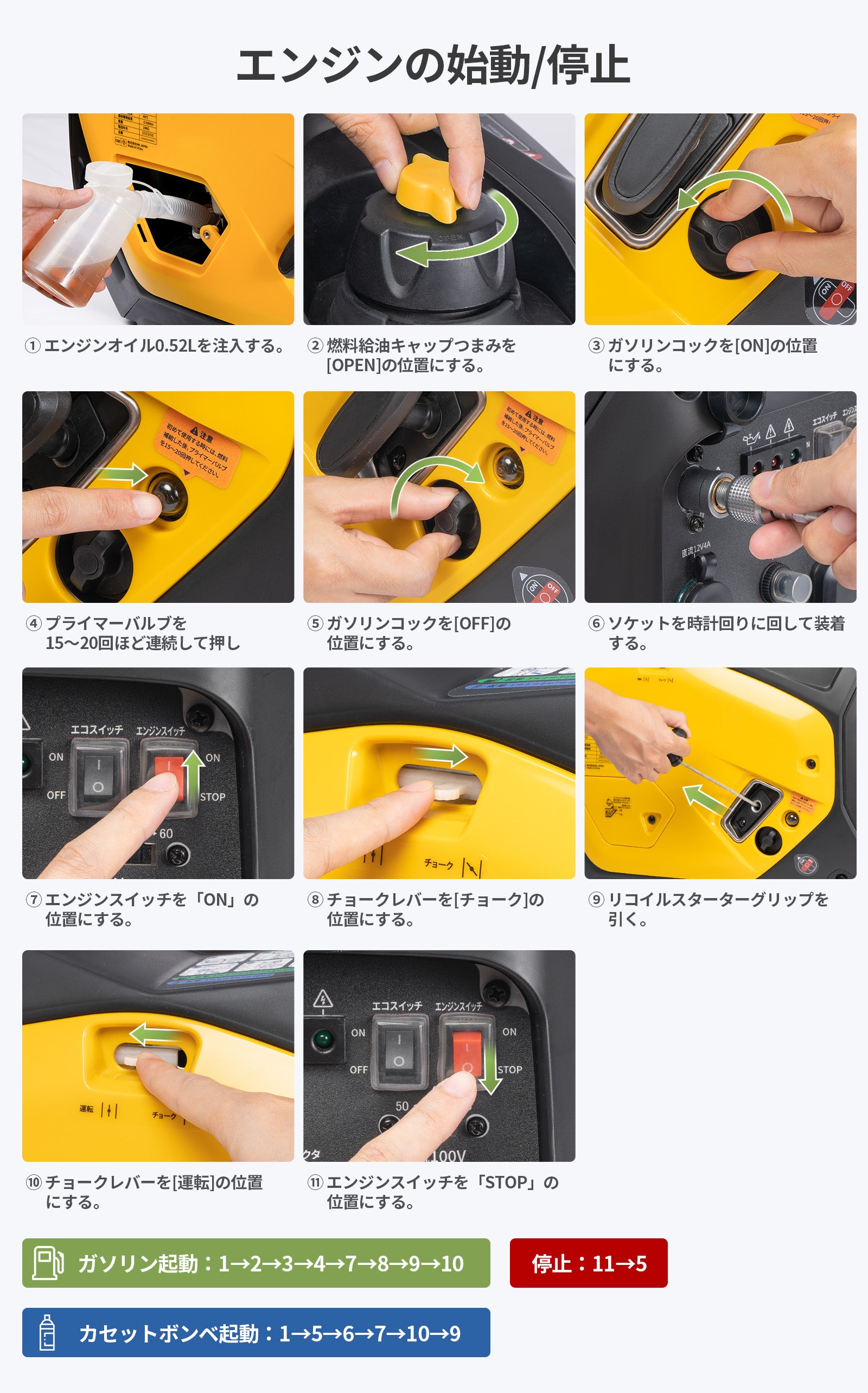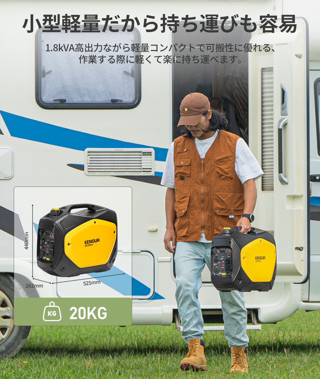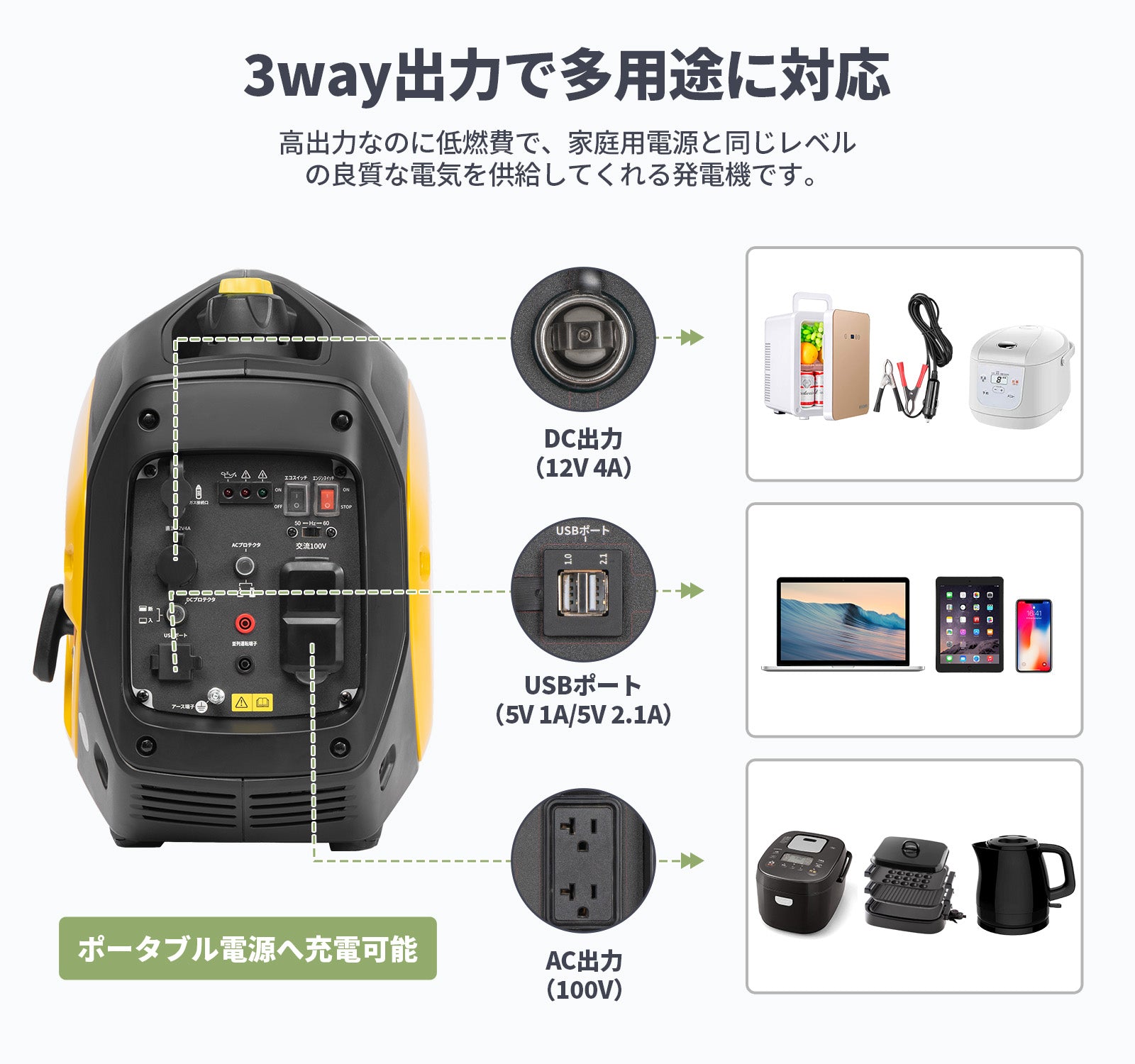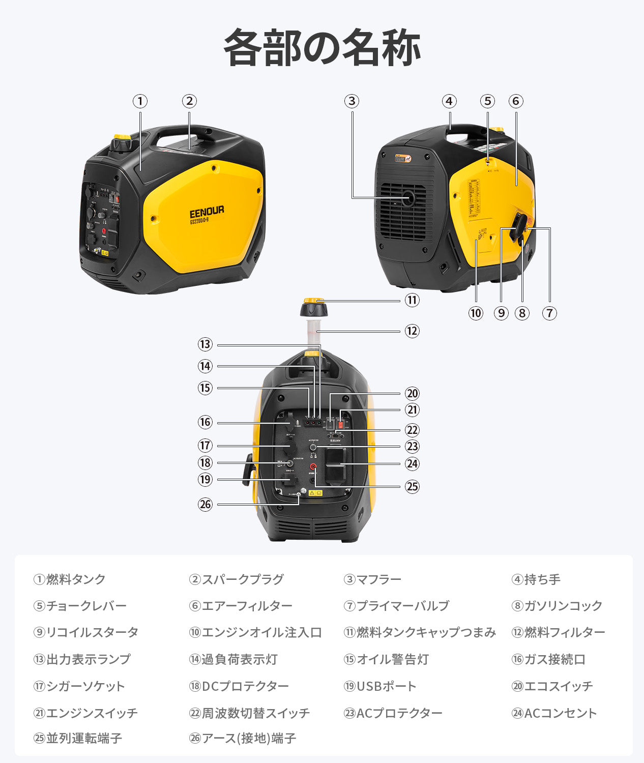 過負荷保護・オイルセンサー・出力リセットボタンなど多重保護機能を搭載しています。
