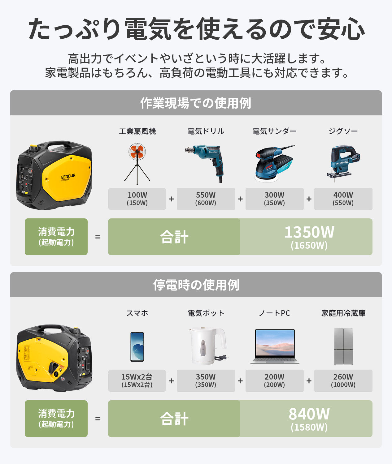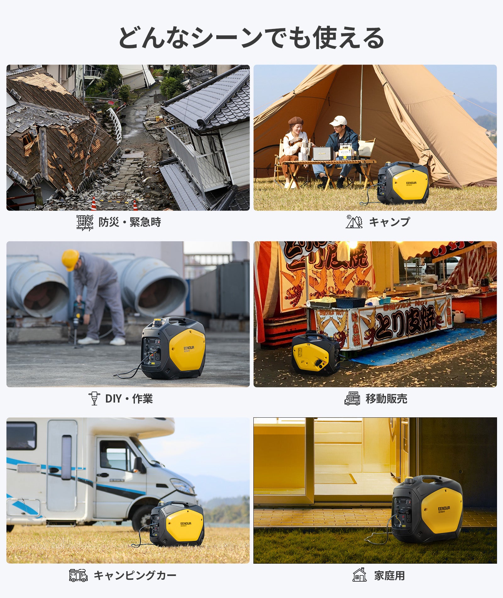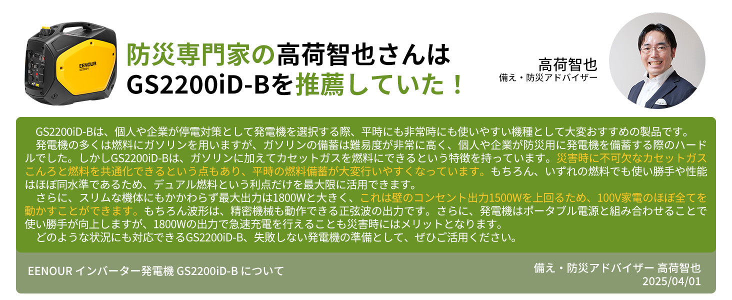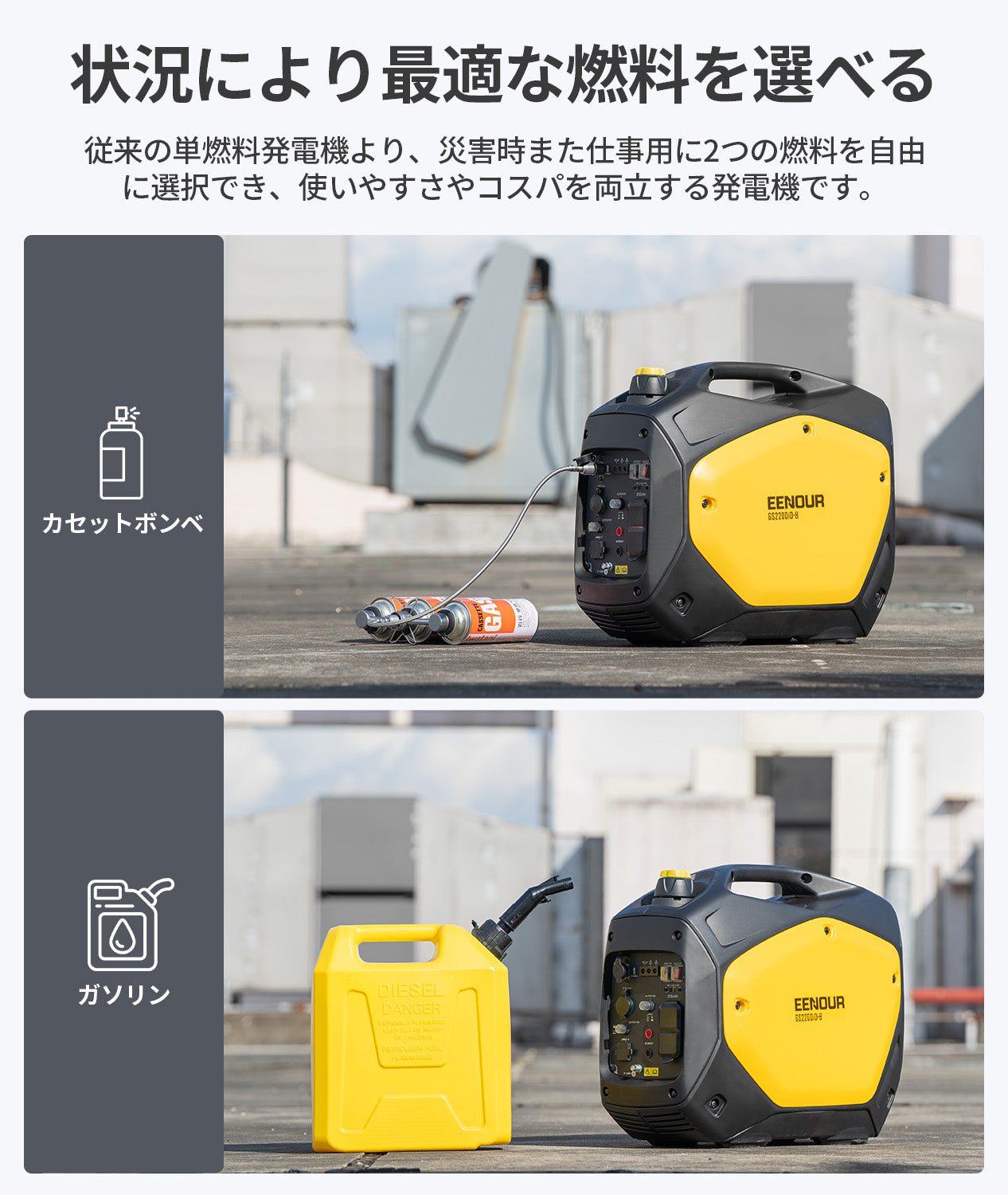 デュアル燃料対応+長時間稼働+安全機能搭載で、防災用として非常に優れています。