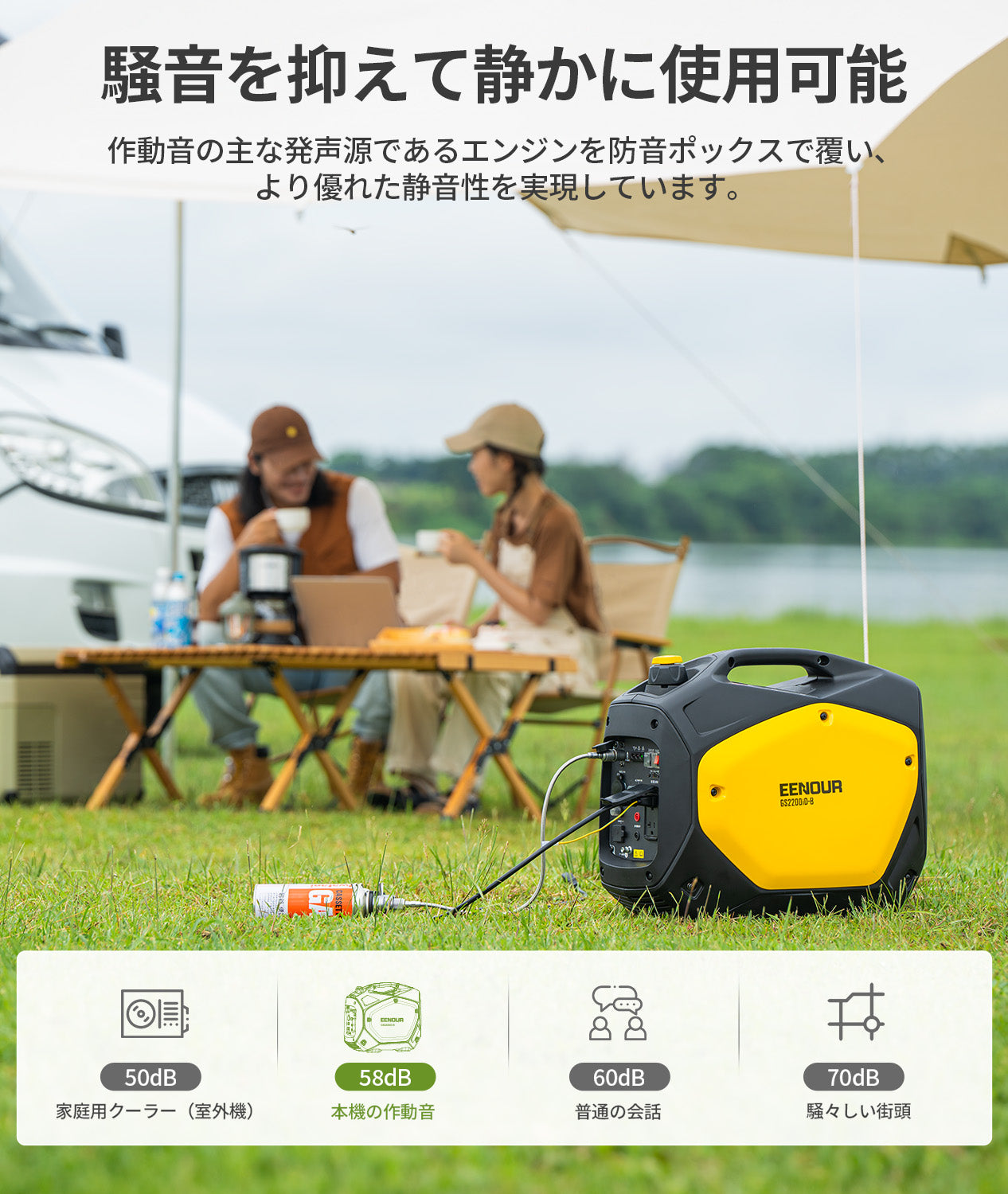 約58dBの静音設計で、一般的な会話レベル。住宅街やキャンプ場でも安心して使えます。