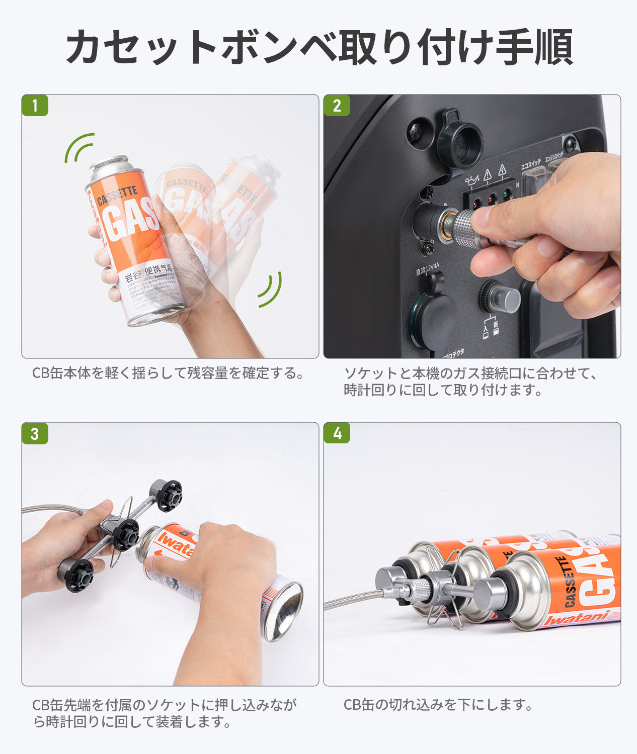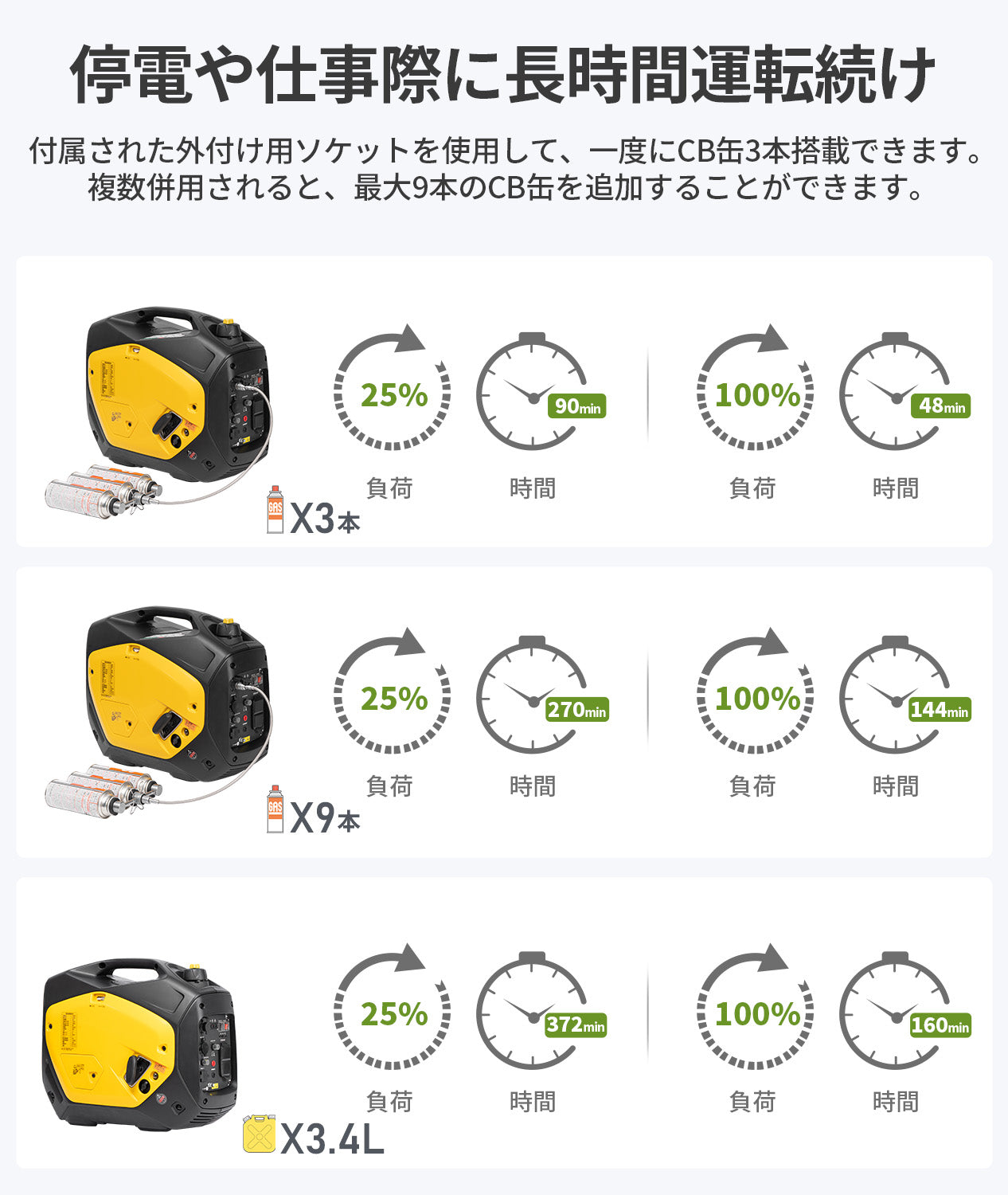 ガソリン満タン(3.4L)で約2.7時間、カセットボンベ3本で約48分(定格負荷時)です。
