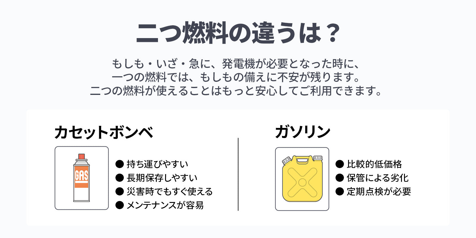 日常使いにはガソリンが経済的。非常時や保管性重視ならカセットボンベが便利です。