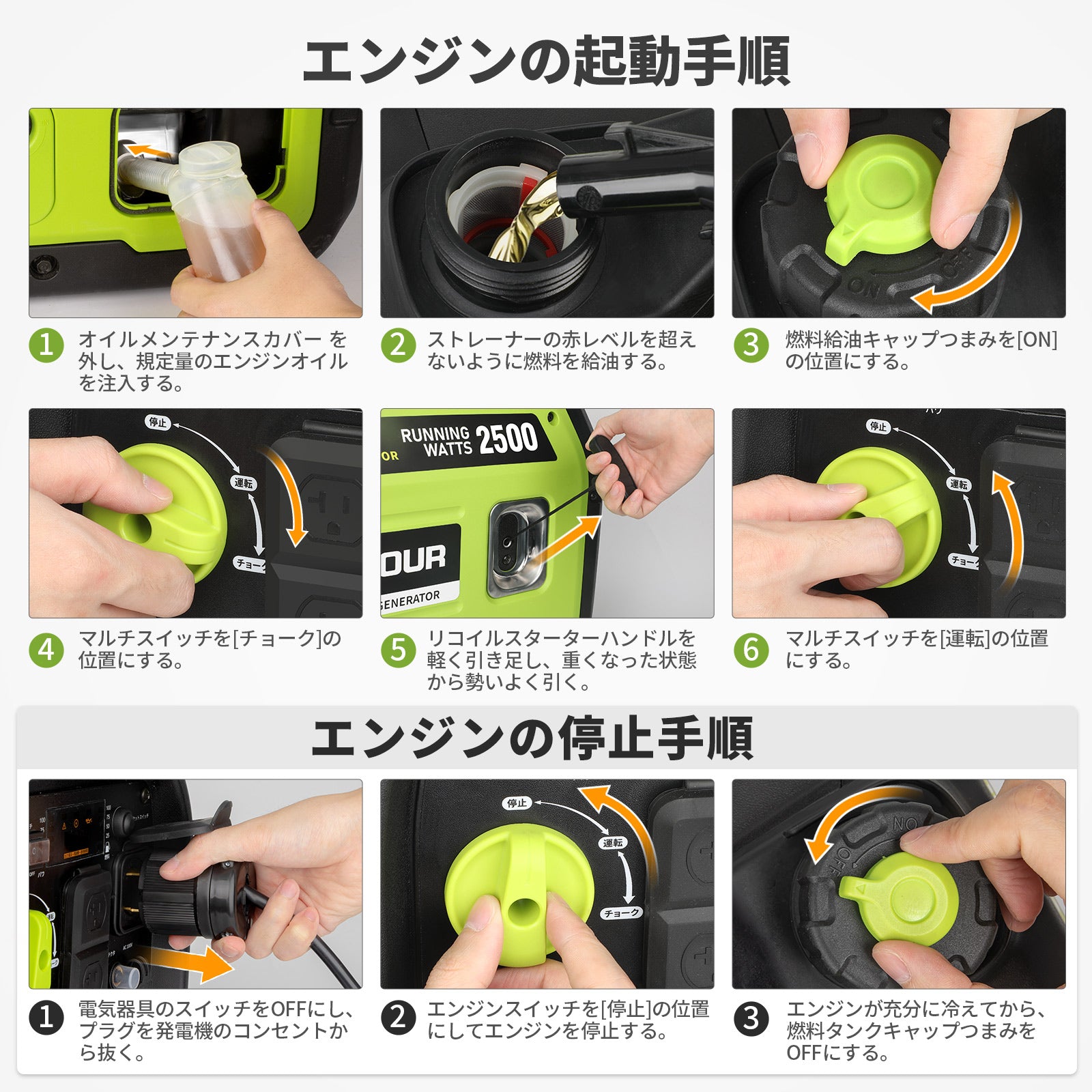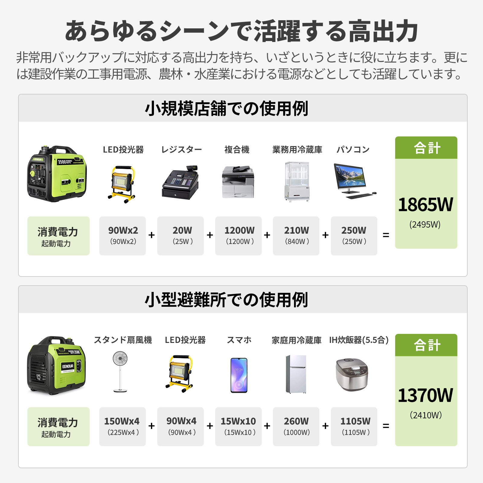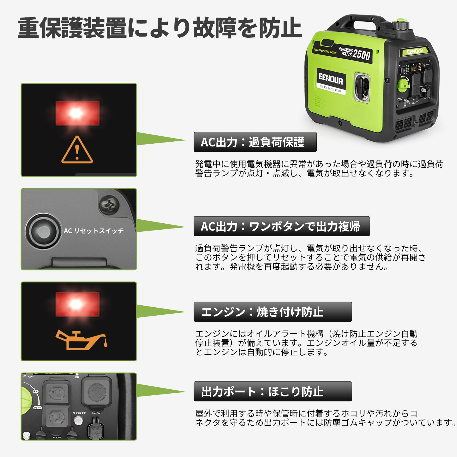 使用する機器の消費電力(W)にご注意ください。発電機の定格出力を超える機器を同時に使用すると、過負荷による停止や故障の原因になります。特に起動時に大きな電力を必要とする機器(エアコン、冷蔵庫、コンプレッサー等)はご注意ください。