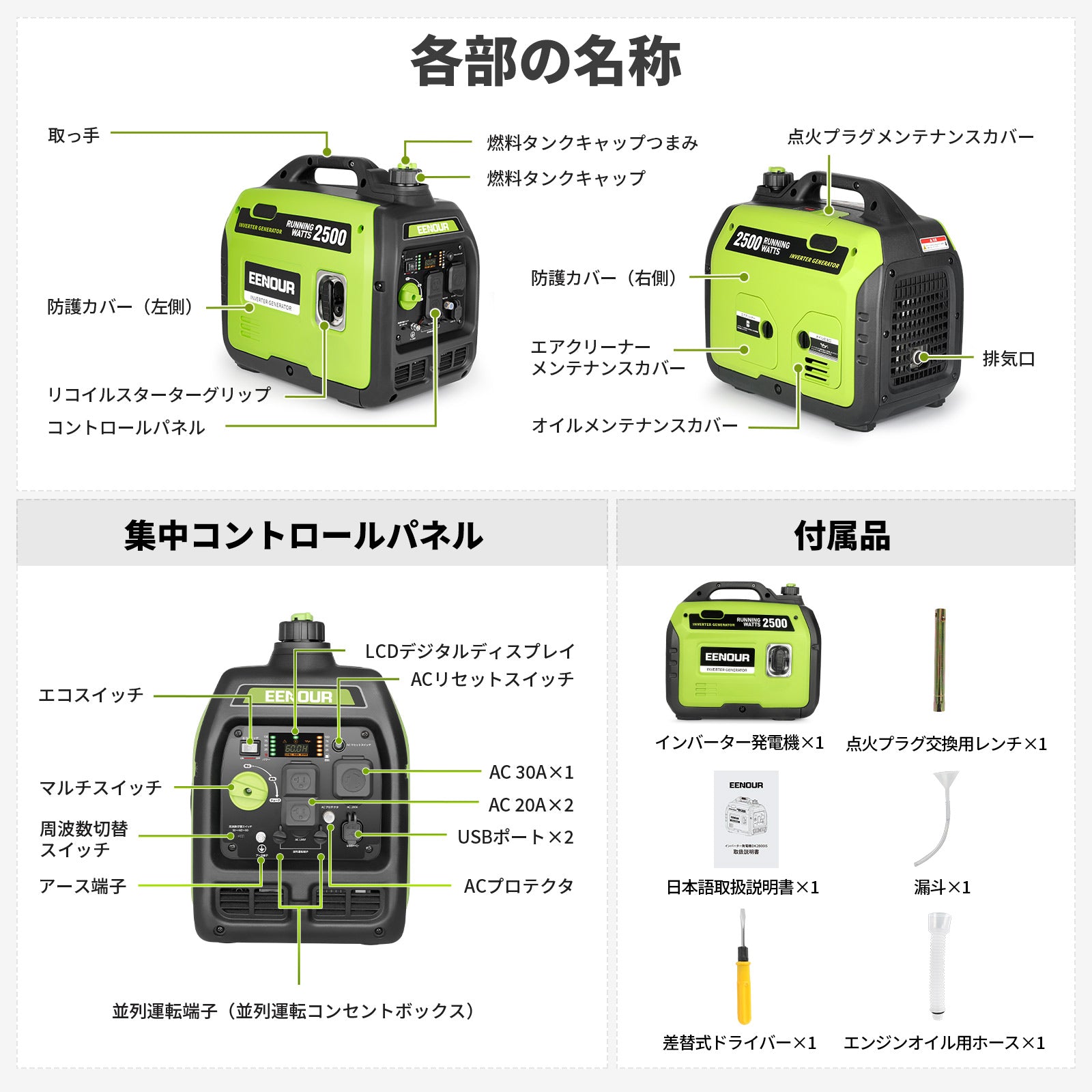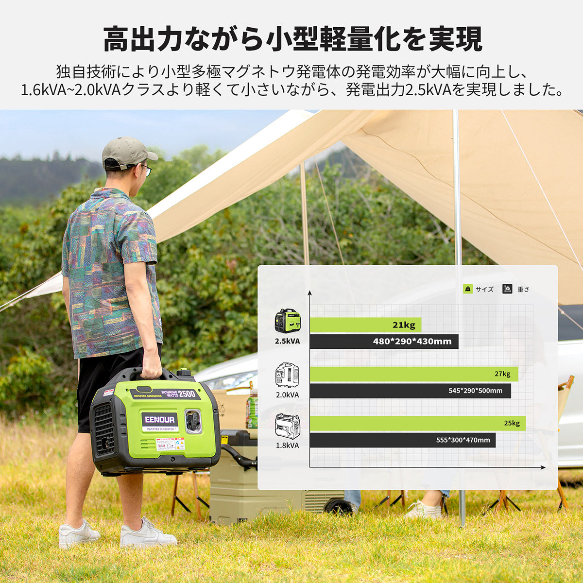 EENOURでは、インバーター式、単相100V・200V対応の小型エンジン発電機を取り扱っております。