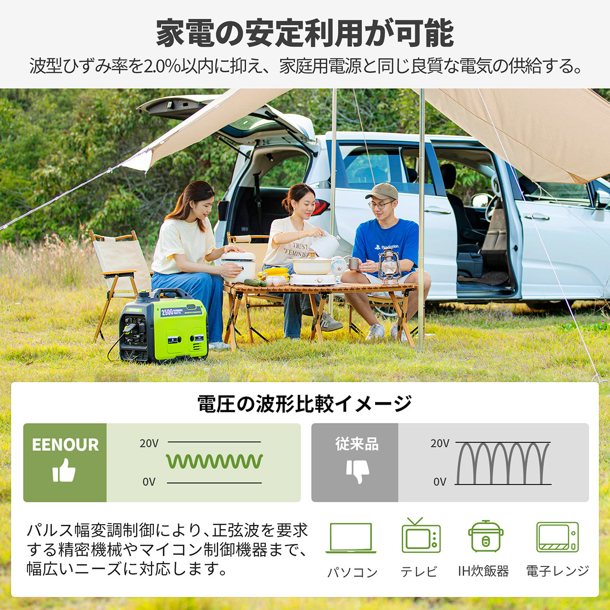 インバーターとは、直流電流を安定した交流電流へ変換する装置です。EENOURのインバーター発電機は50Hz/60Hz正弦波でコンピューターや精密機器にも安心してご使用いただけます。