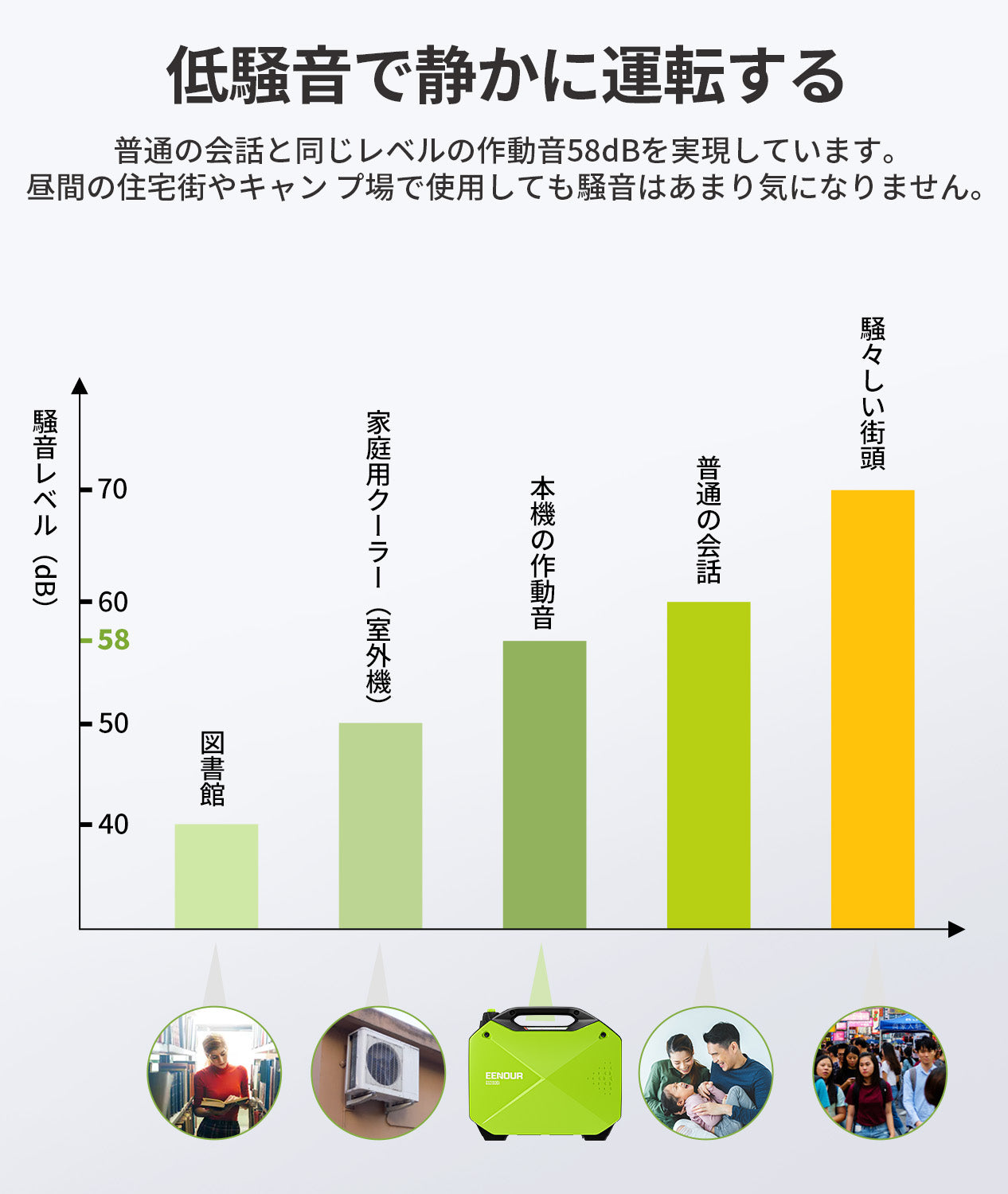 騒音レベルは機種によって異なりますが、インバーター発電機では比較的静音設計となっており、一般的に50〜60dB(7m地点)程度です。これは通常の会話程度の音量です。