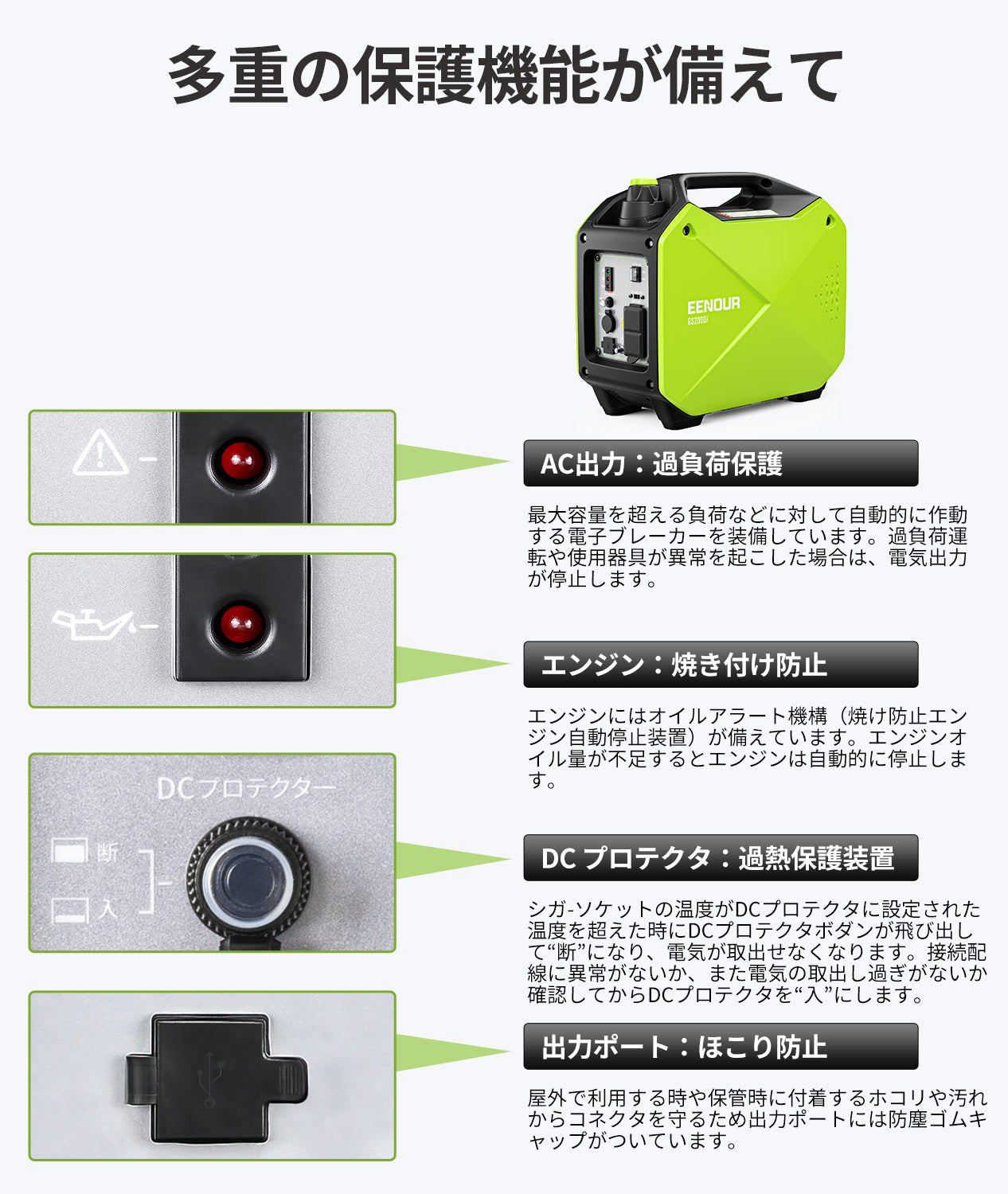 インバーターとは、直流電流を安定した交流電流へ変換する装置です。EENOURのインバーター発電機は50Hz/60Hz正弦波でコンピューターや精密機器にも安心してご使用いただけます。