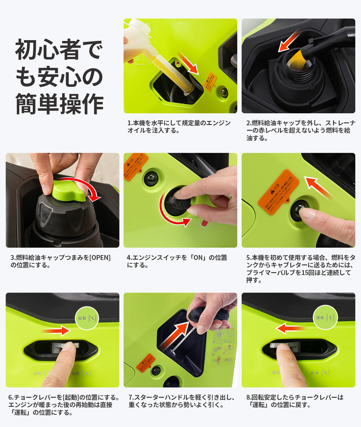 • ・使用前:オイル量・燃料残量の確認、エアフィルターの状態確認