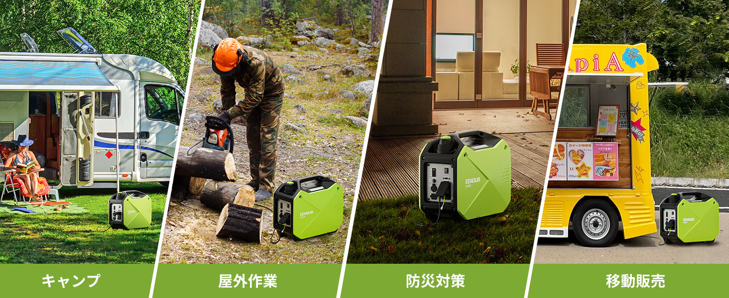 EENOURでは、インバーター式、単相100V・200V対応の小型エンジン発電機を取り扱っております。