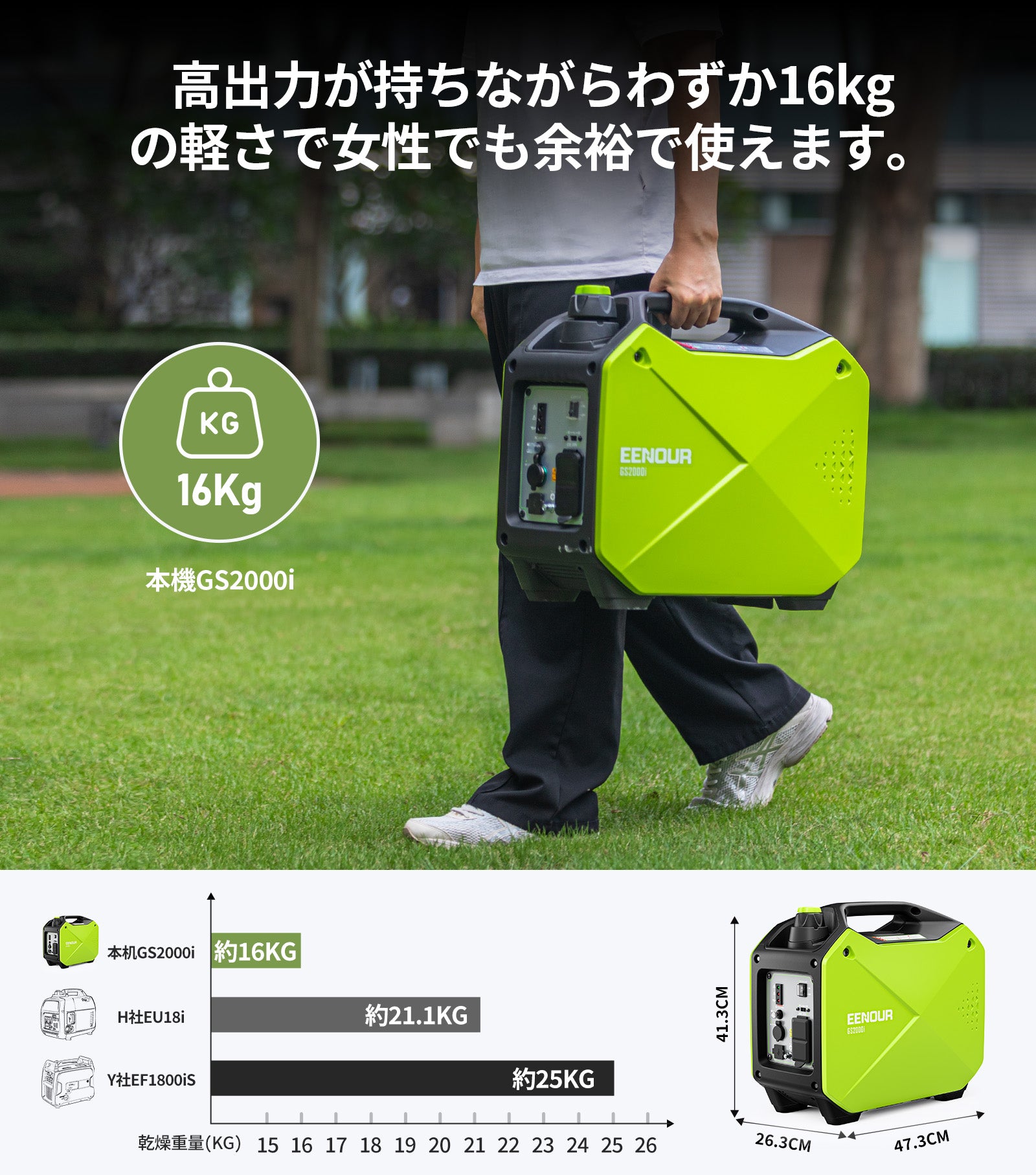 持ち運びも苦ではなく、ちょっとした庭仕事の電源にも使っています。女性でもなんとか一人で移動できます。