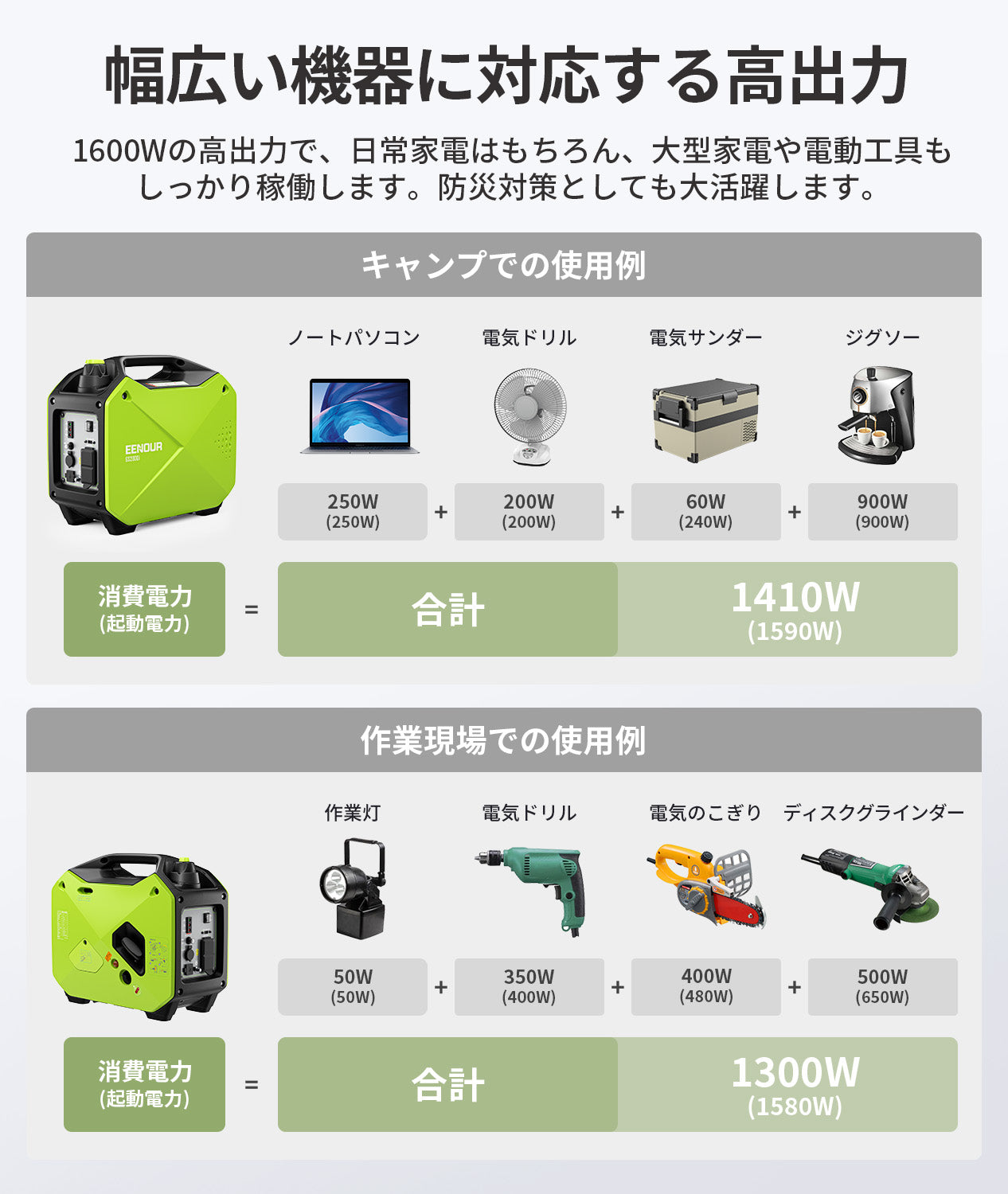 使用する機器の消費電力(W)にご注意ください。発電機の定格出力を超える機器を同時に使用すると、過負荷による停止や故障の原因になります。特に起動時に大きな電力を必要とする機器(エアコン、冷蔵庫、コンプレッサー等)はご注意ください。