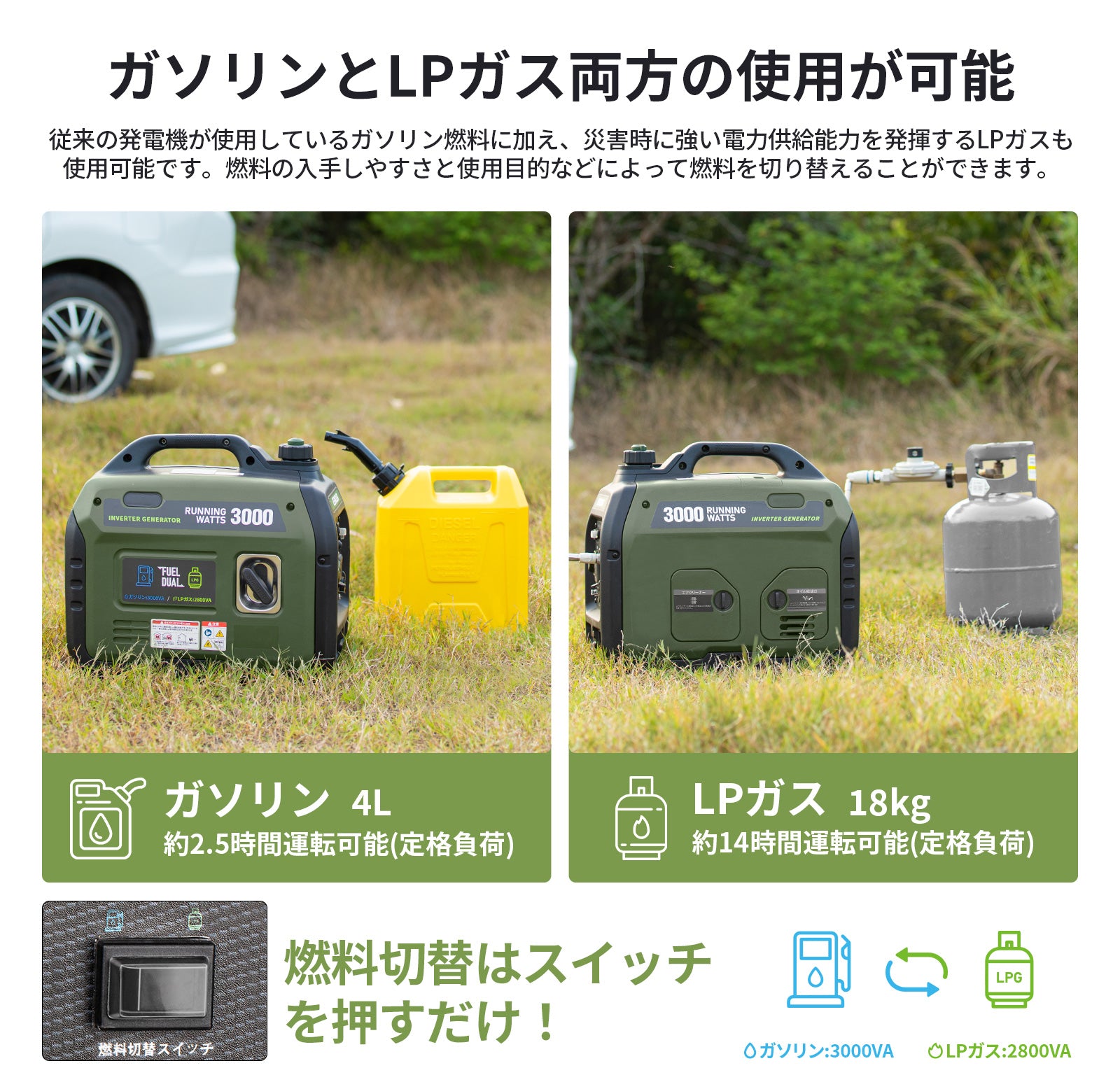 はい、一部のモデルでは並列運転が可能です。並列運転用のケーブルを使用することで、2台の発電機を接続して出力を倍増できます。対応機種や接続方法については、各製品の取扱説明書または並列運転ガイドをご覧ください。