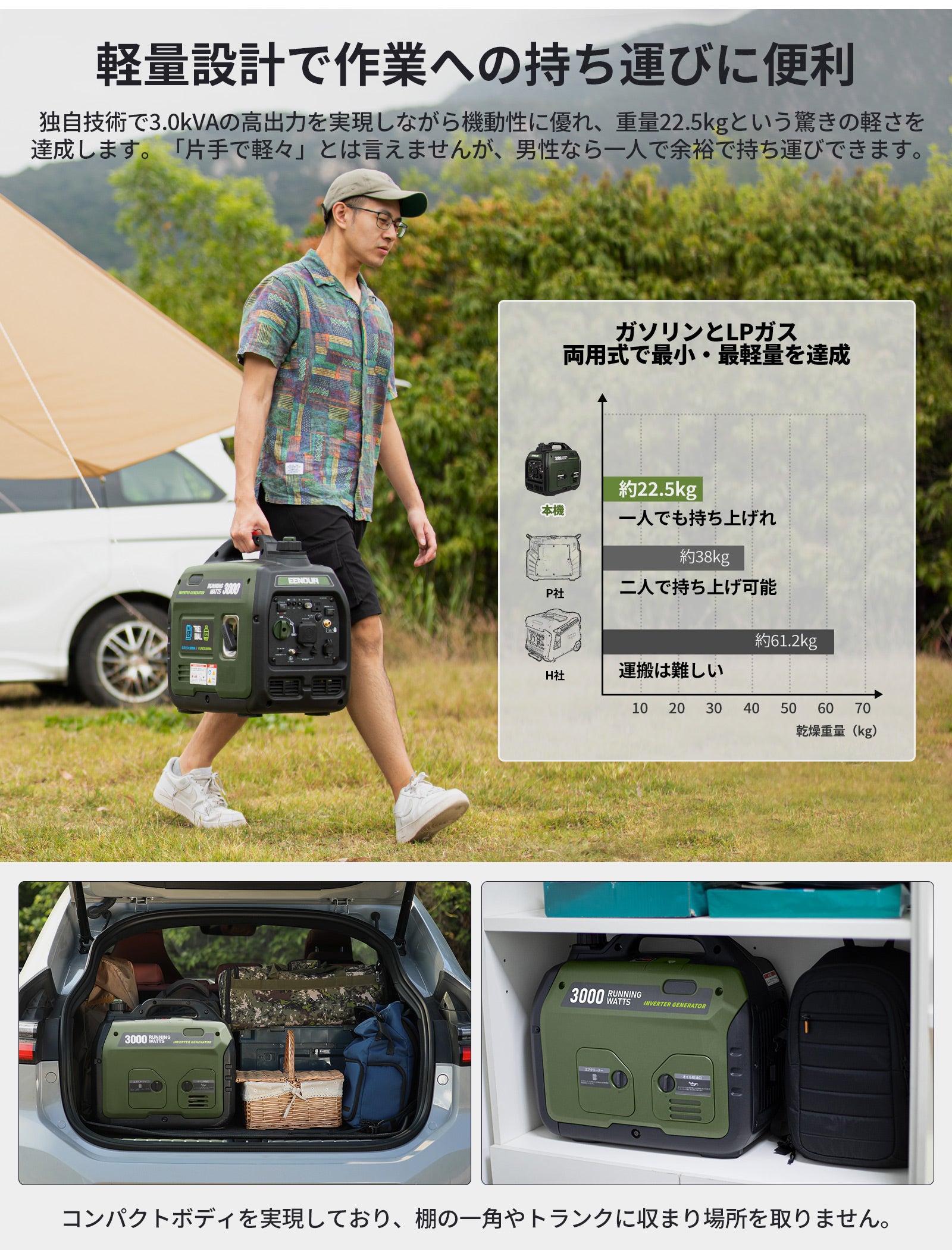 EENOURでは、インバーター式、単相100V・200V対応の小型エンジン発電機を取り扱っております。