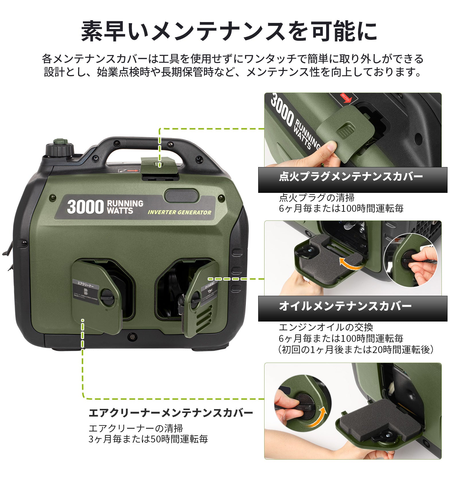- ・定期(50時間/半年ごと):オイル交換、プラグ清掃・交換、エアフィルター清掃