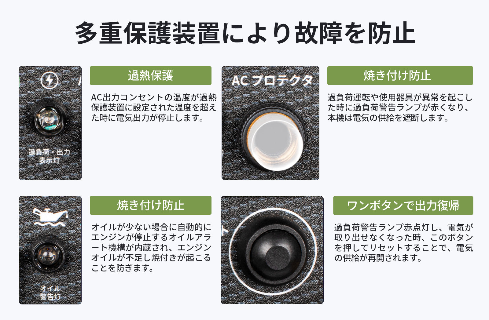 使用する機器の消費電力(W)にご注意ください。発電機の定格出力を超える機器を同時に使用すると、過負荷による停止や故障の原因になります。特に起動時に大きな電力を必要とする機器(エアコン、冷蔵庫、コンプレッサー等)はご注意ください。