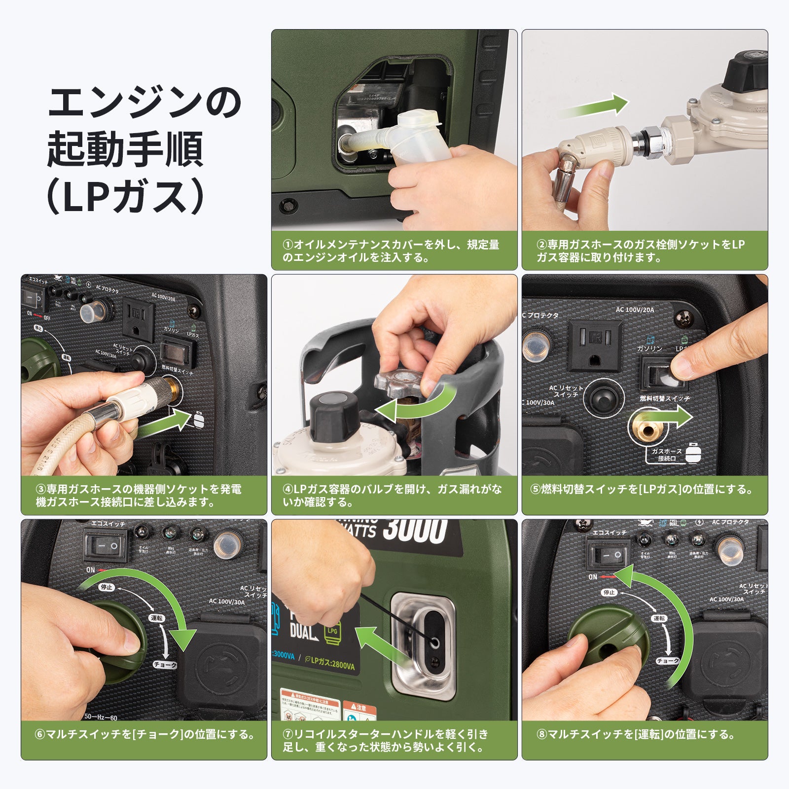 - ・使用前:オイル量・燃料残量の確認、エアフィルターの状態確認
