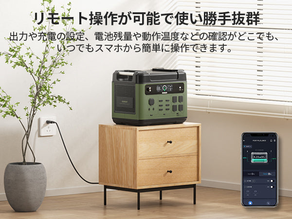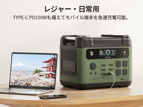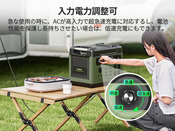 急速充電が必要な場合は高出力で、バッテリーの劣化を抑えたい場合や、電力制限のある環境では低出力で充電可能。キャンプ場などの電源容量が限られた場所でも柔軟に対応できます。