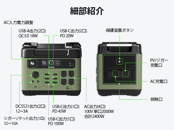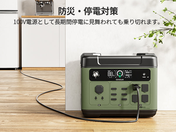定格出力2000W、瞬間最大出力4800Wの高出力により、IH調理器、電気毛布、冷蔵庫、炊飯器、ドライヤーなどの家電にも対応可能です。