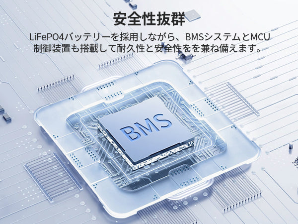 長寿命・高安全性のリン酸鉄リチウム(LiFePO4)電池を採用