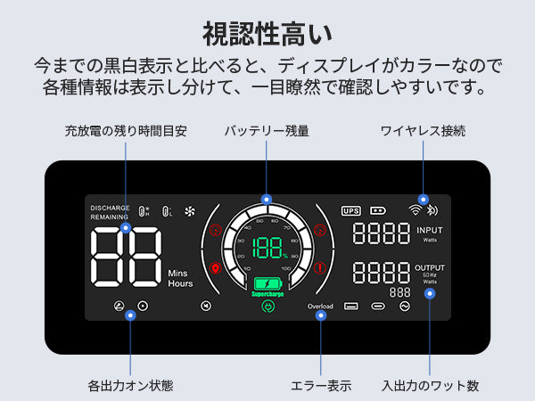 入力/出力電力、バッテリー残量、充電モード、温度警告など、現在の運転状況をリアルタイムで分かりやすく表示します。