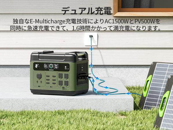 独自の「E-Multicharge」技術と双方向インバーターにより、AC1500Wとソーラーパネル(PV500W)の同時充電が可能。最短約1.6時間でフル充電できます。