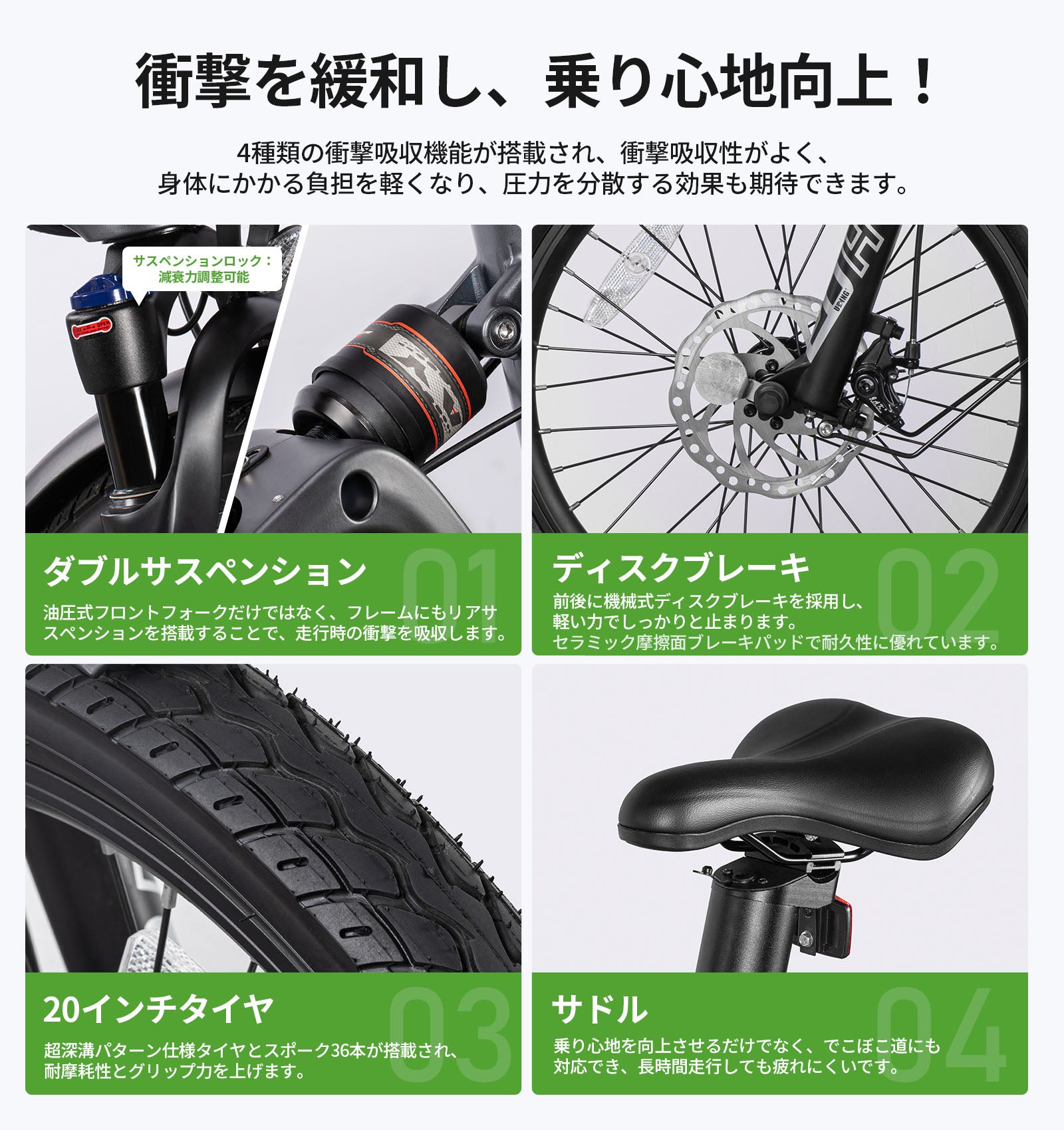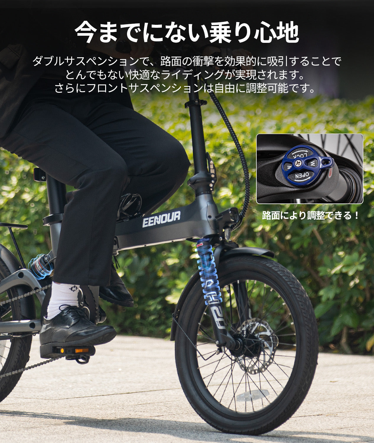 サスペンションが前後についており多少の段差も気にならない。乗っていて不安感は全くなく非常に爽快。