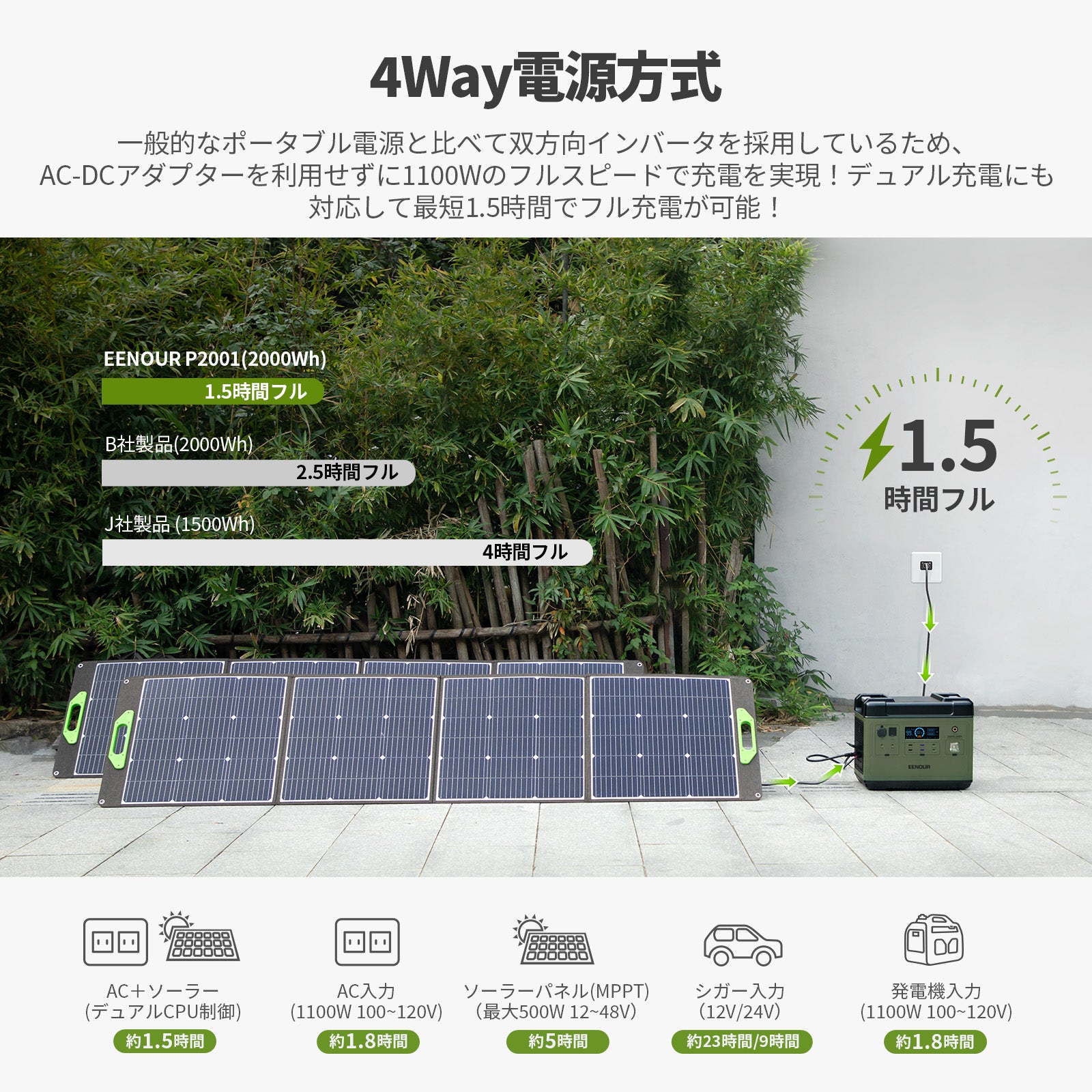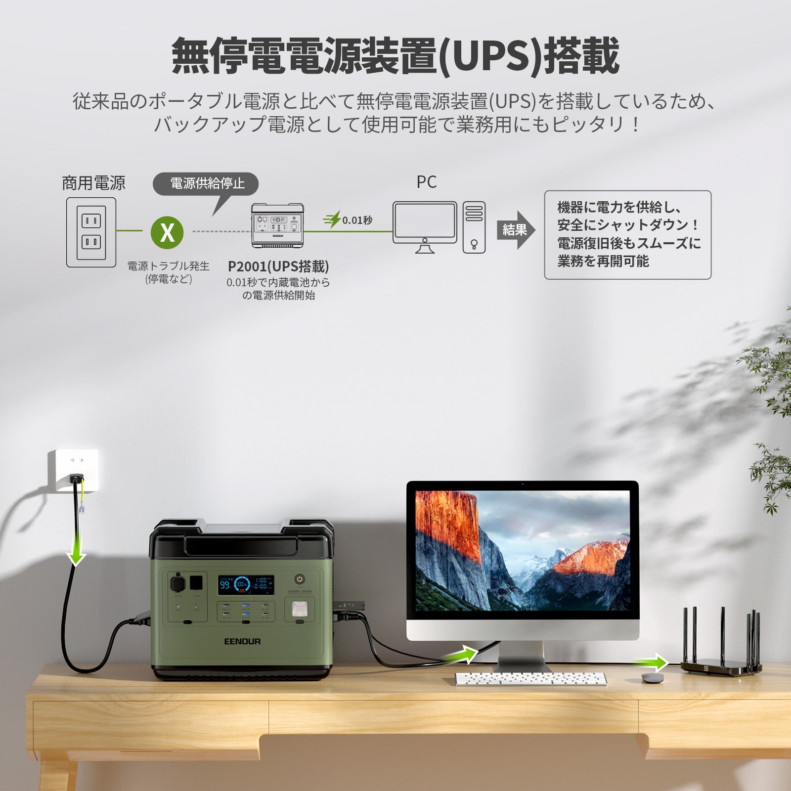 P2001は、2000Whの大容量と最大4000W瞬間出力を備えた、家庭でも業務でも安心して使える本格派ポータブル電源です。