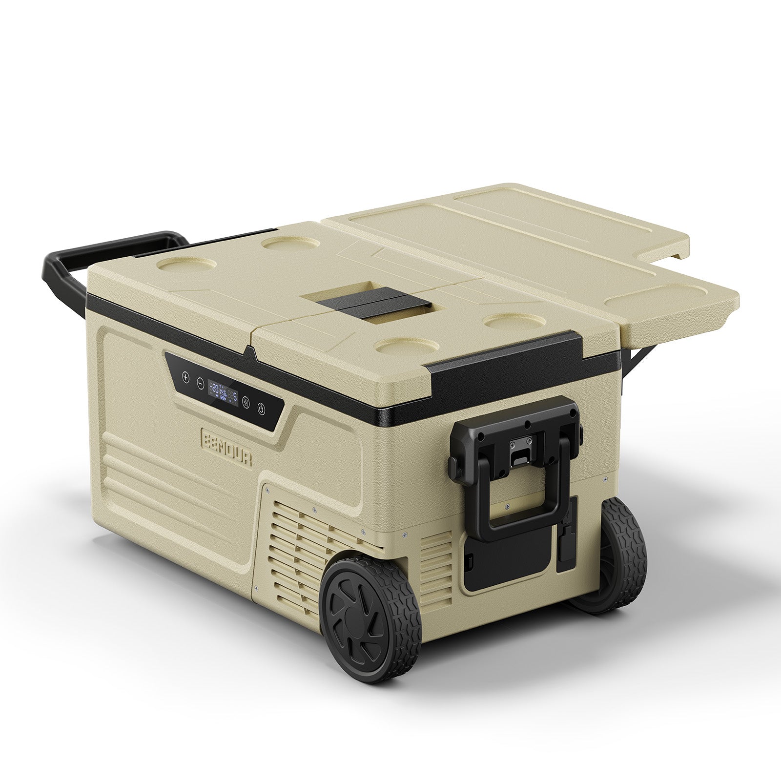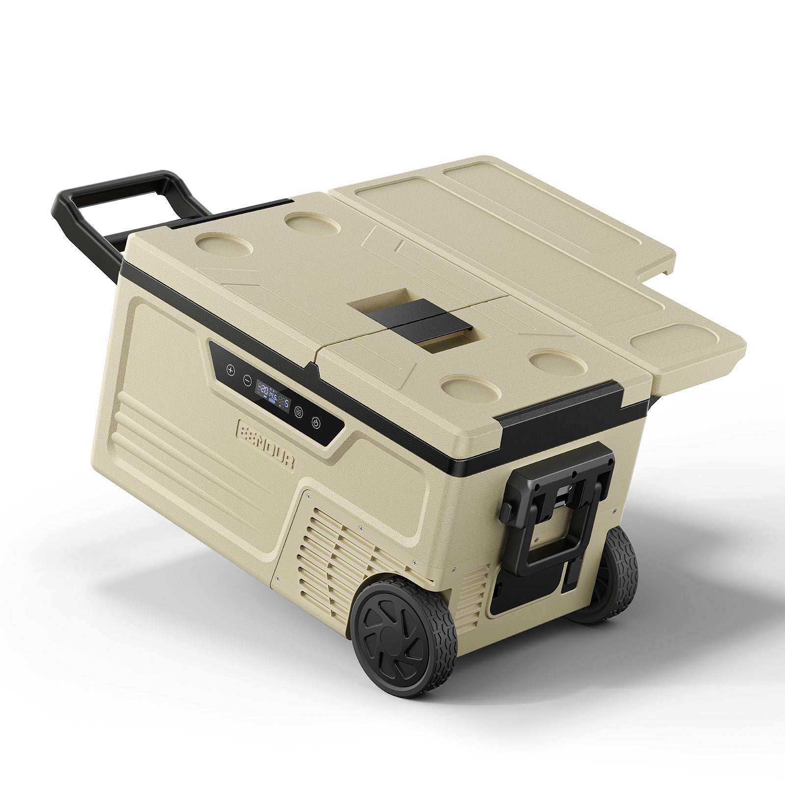 2室2ドアで独立温度設定が可能、冷凍・冷蔵の自由な組み合わせに対応。庫内温度差は約2℃に抑え、冷却ムラを軽減し鮮度をしっかりキープ。171Whバッテリー対応でコードレス使用も可能。耐荷重約20kgの折りたたみテーブル付きで、アウトドアでも便利に使える。小室約18分・大室約27分で0℃に到達する急速冷却。コンパクトながら高機能な一台。