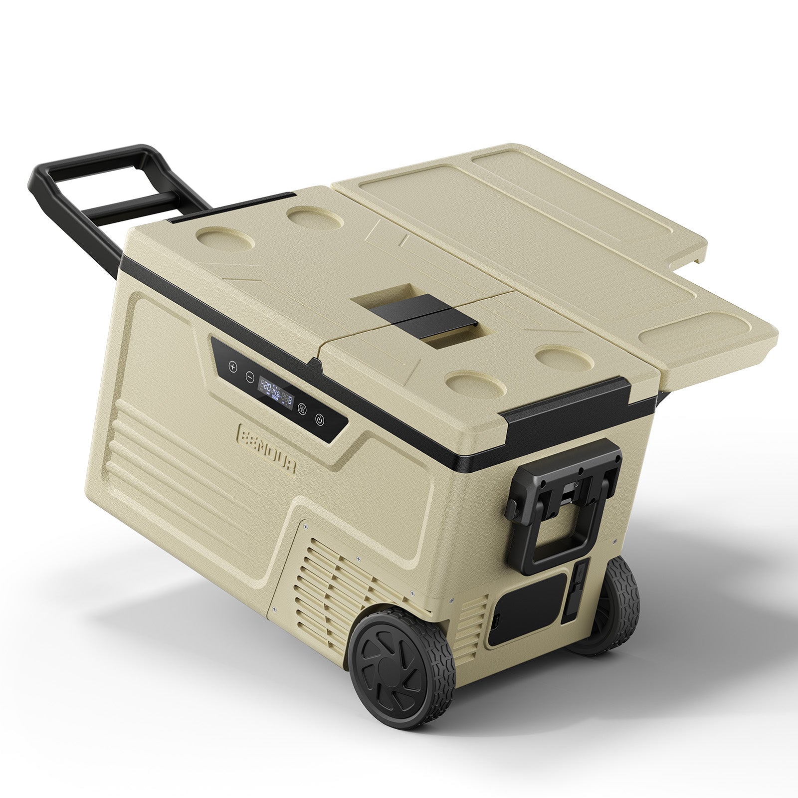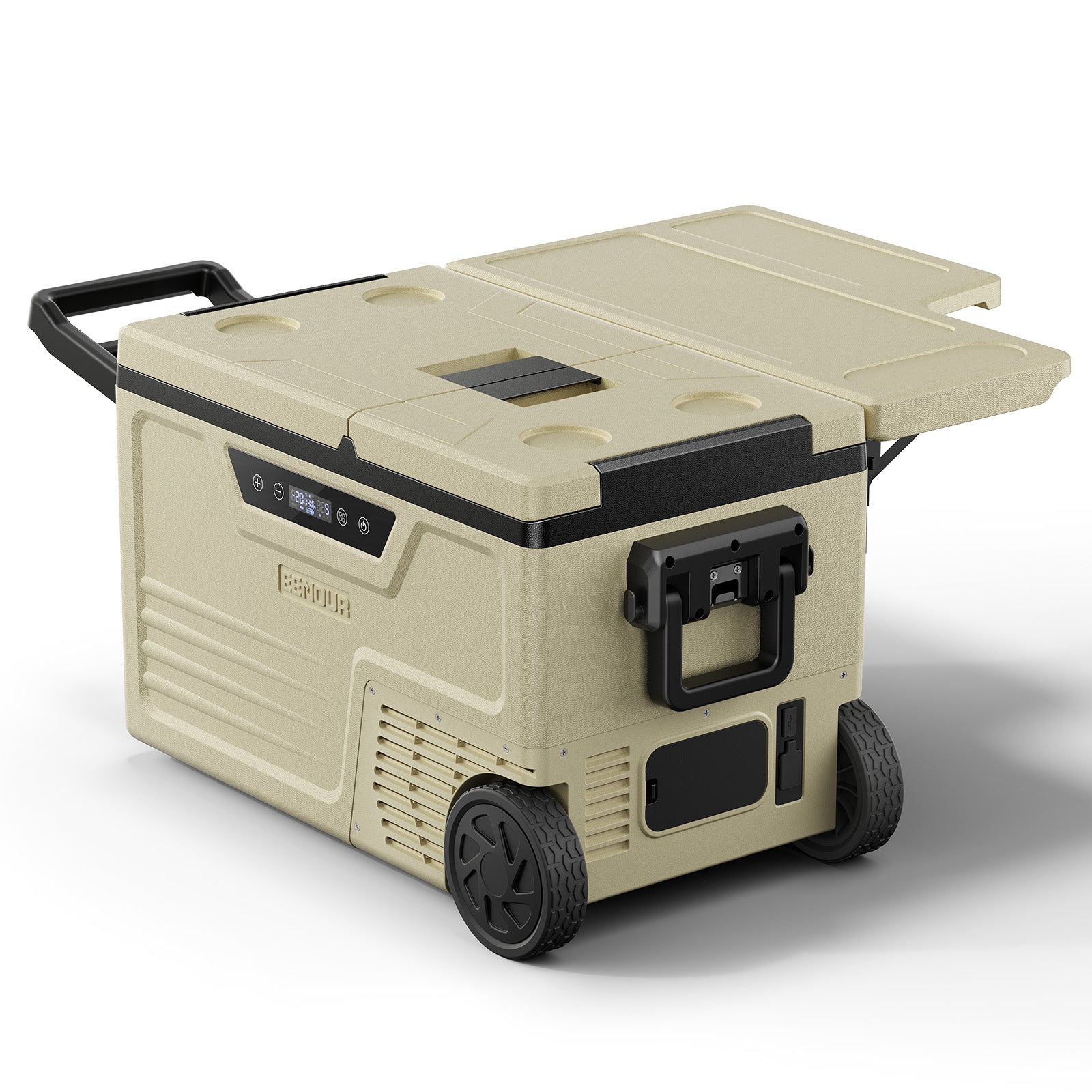 48L大容量モデル。2室独立制御で冷凍+冷蔵など多彩な使い分けが可能。庫内温度差は約2℃に抑え、均一な冷却で食材の鮮度を保持。171Whバッテリー対応で長時間のアウトドア使用にも対応。側面には耐荷重約20kgの大型テーブルを搭載し、利便性も向上。高性能コンプレッサーによるスピード冷却で、ファミリーやグループキャンプに最適な一台。