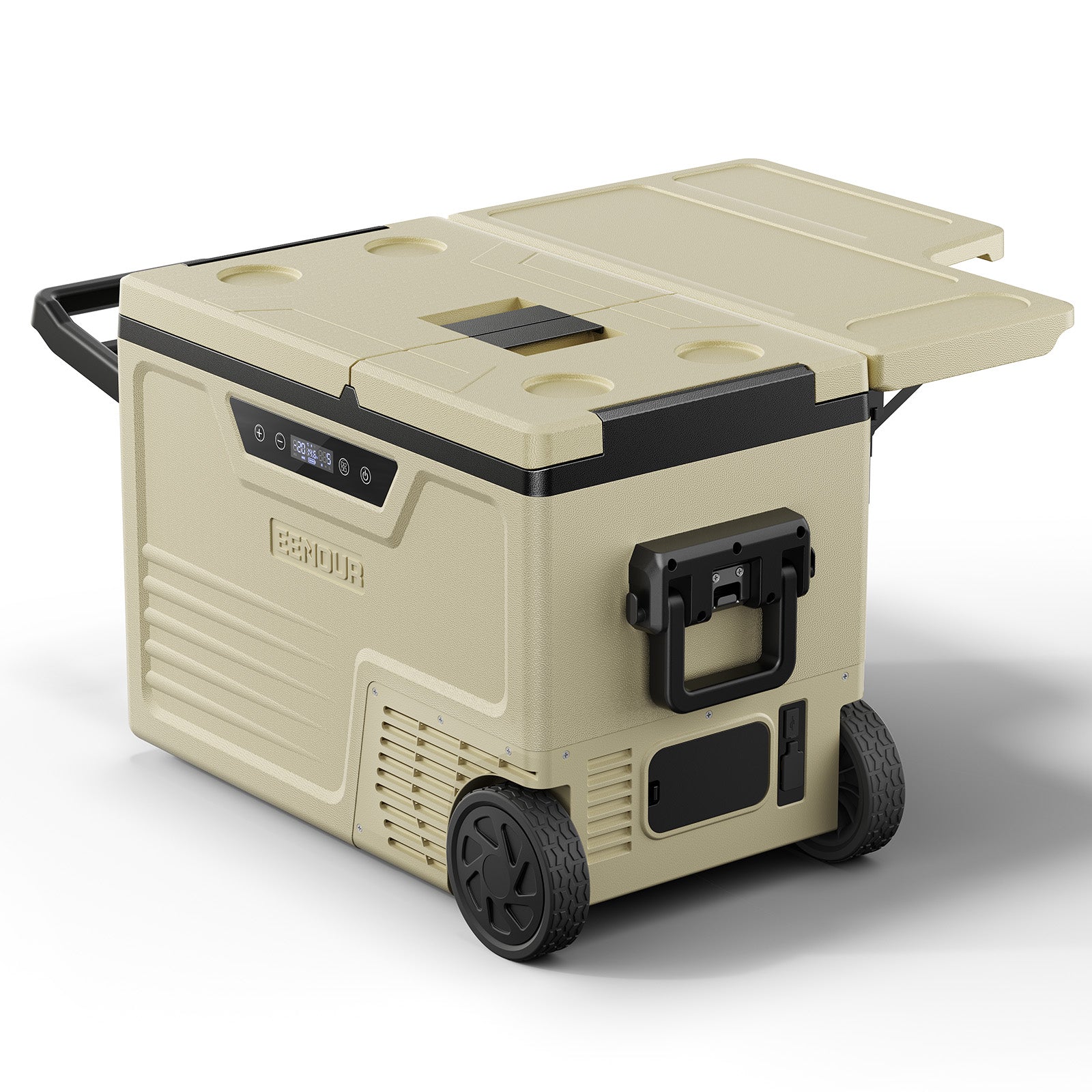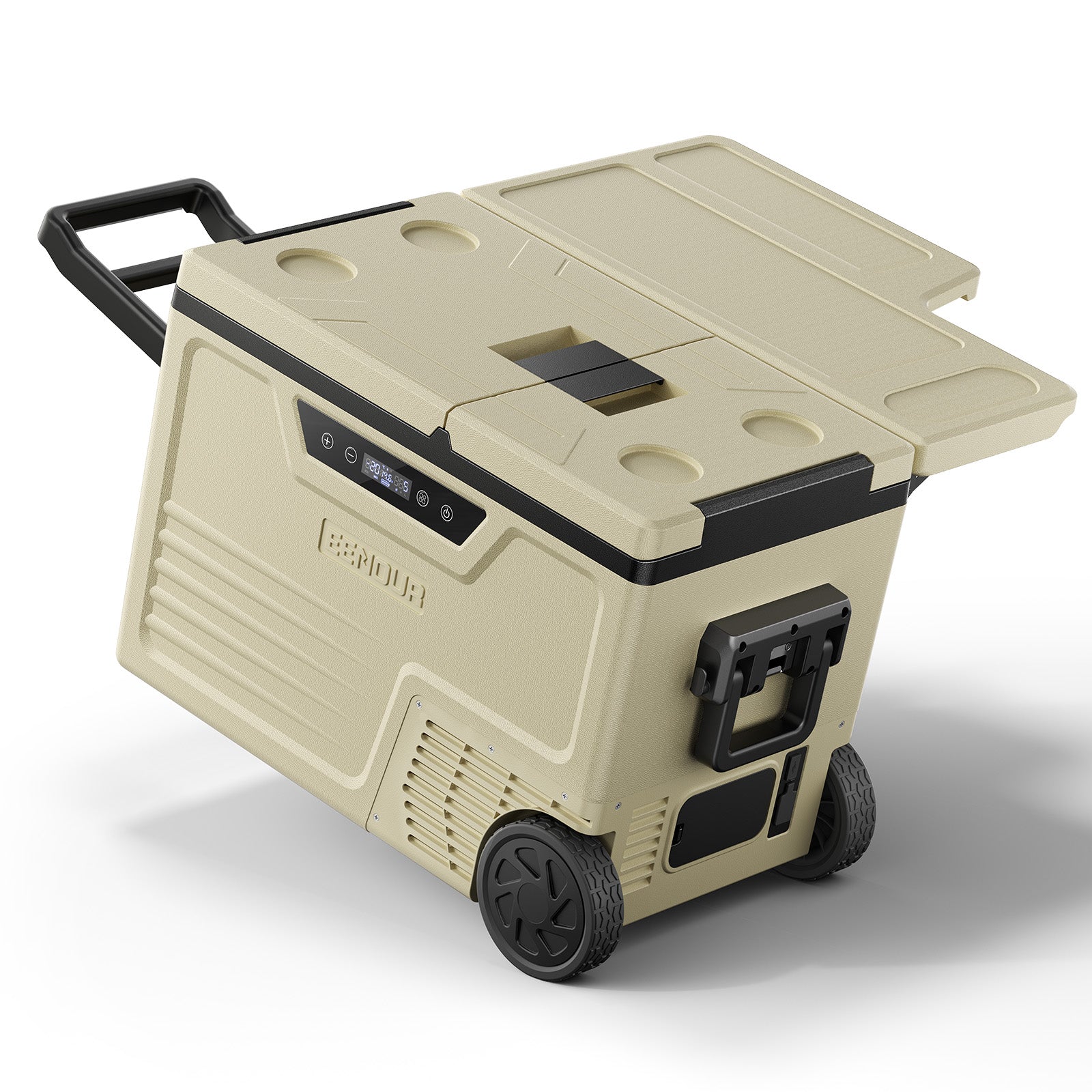 58Lの大容量ハイエンドモデル。2室2ドアの独立温度制御で、冷凍・冷蔵を自在に設定可能。庫内温度差は約2℃に抑え、安定した均一冷却を実現。171Whバッテリー対応で長時間のコードレス運用が可能。耐荷重約20kgの折りたたみテーブル付きで、作業台や食卓としても活躍。高出力コンプレッサーによる強力冷却で、大人数や長期アウトドアに最適。