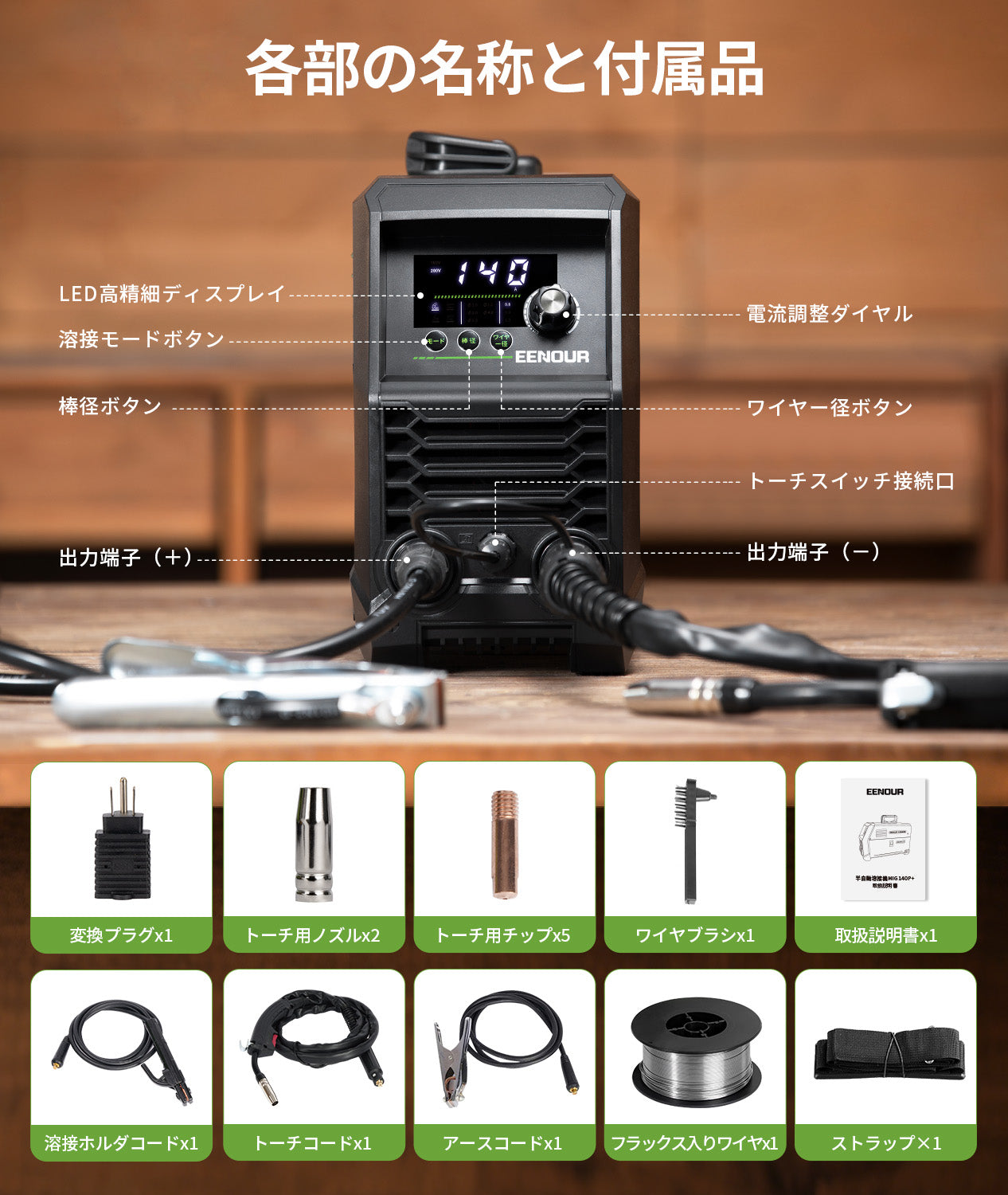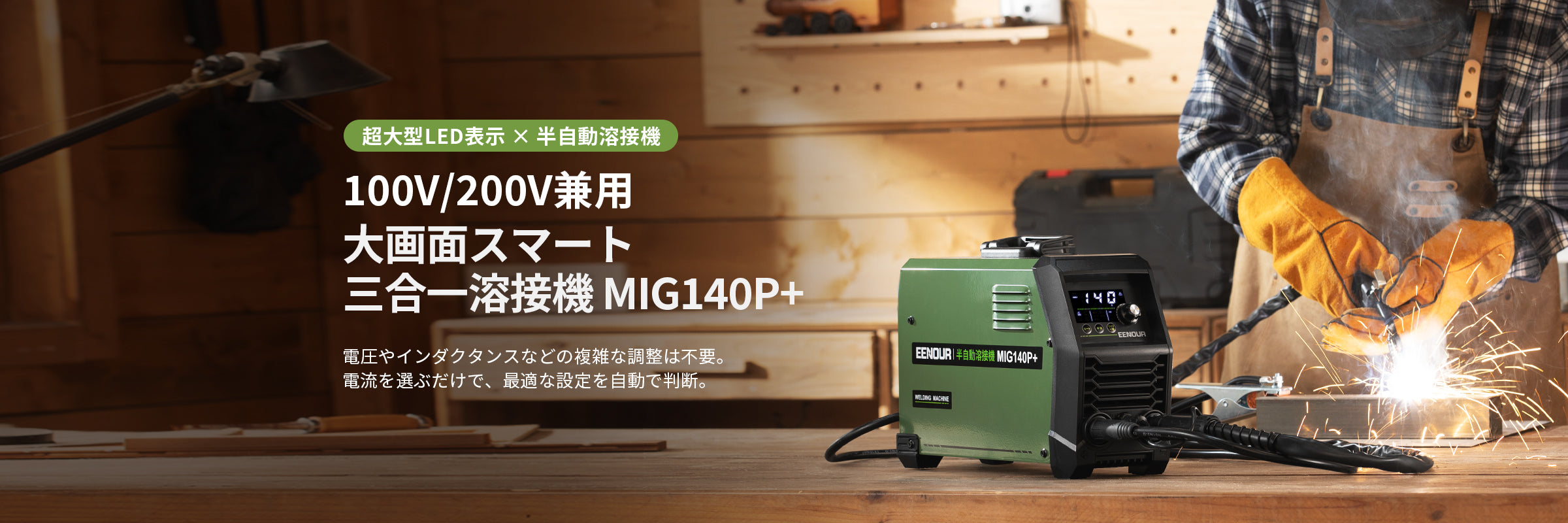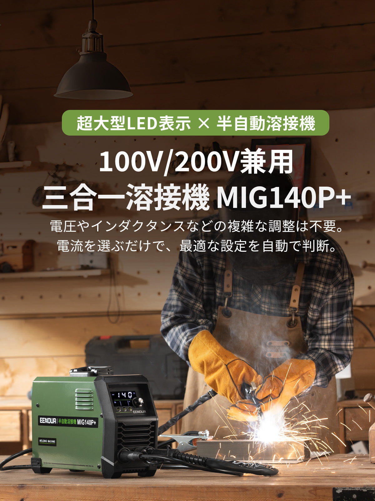LED高精細ディスプレイ搭載 3in1半自動溶接機「MIG140P+」。溶接状態を見える化し、操作はダイヤルひとつ。はじめてのDIYから修理・現場作業まで、誰でも安定した仕上がりを目指せる半自動溶接機です。
